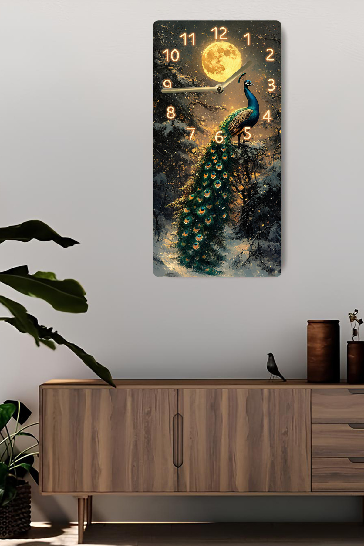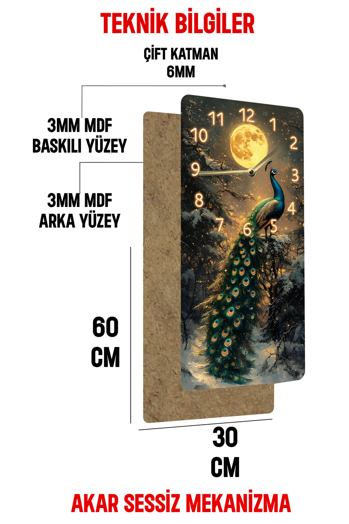 MDF Dikdörtgen Dekoratif Duvar Saati – Tavus Kuşu ve Ay Desenli 30x60 cm UV Baskı – USD024