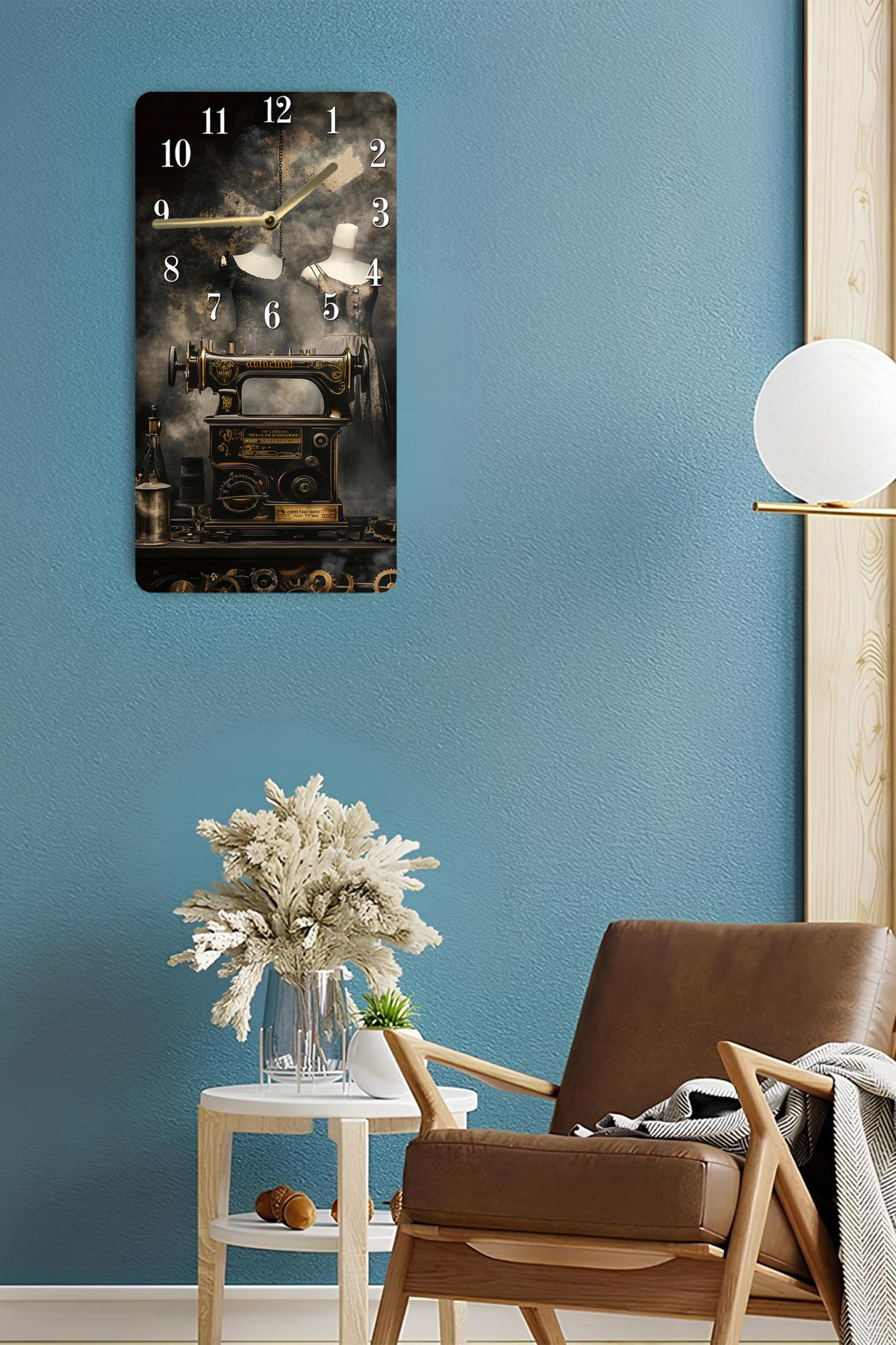 MDF Dikdörtgen Dikiş Makinesi Desenli UV Baskı Sessiz Duvar Saati 30x60 cm – USD027