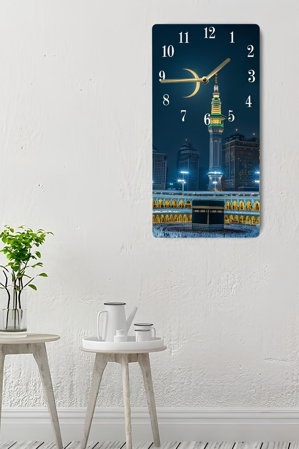 MDF Dikdörtgen Duvar Saati – Kâbe ve Mescid-i Haram Manzaralı – 30x60 cm UV Baskı – USD029