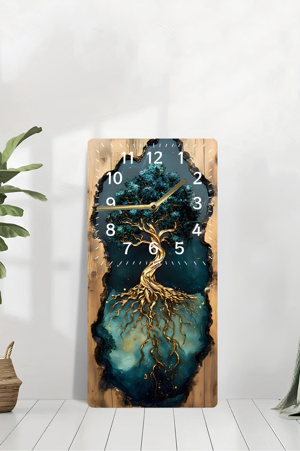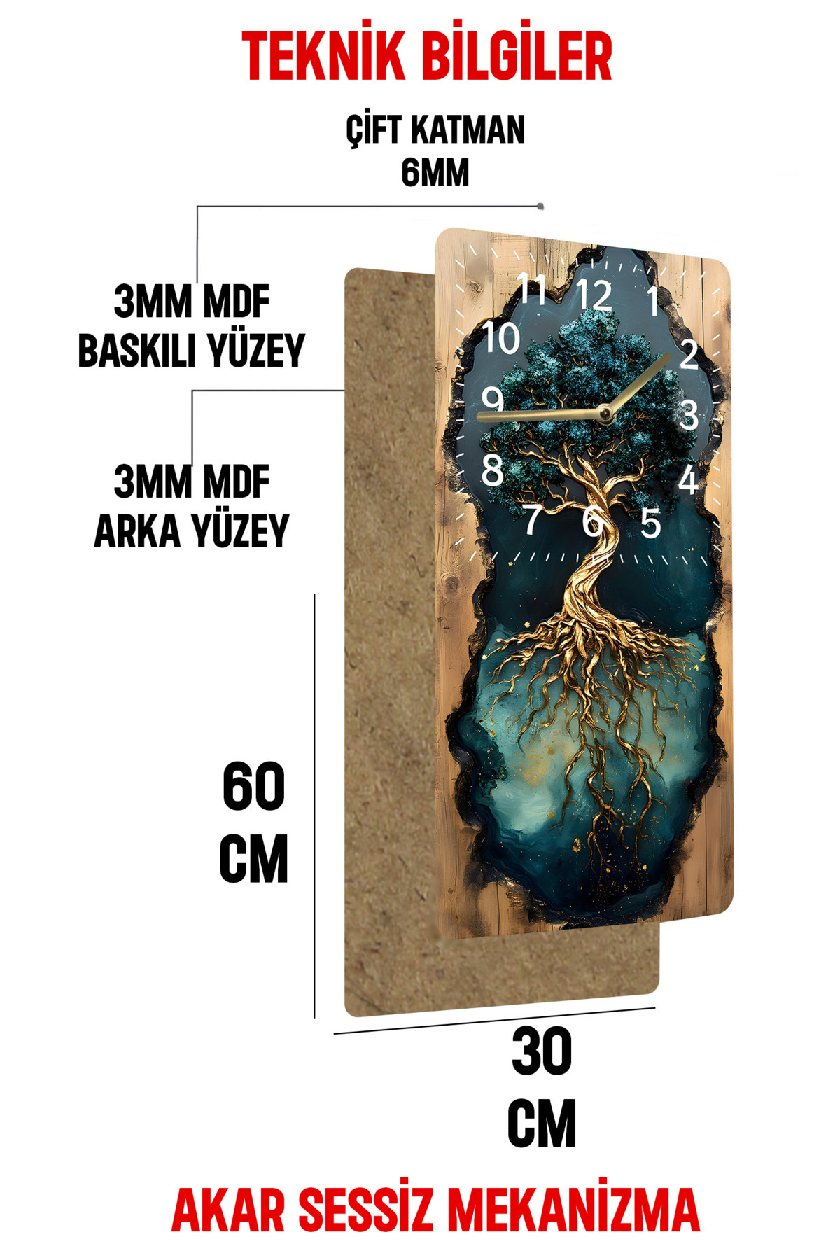 MDF Dikdörtgen Hayat Ağacı Desenli UV Baskı Sessiz Duvar Saati 30x60 cm – USD017