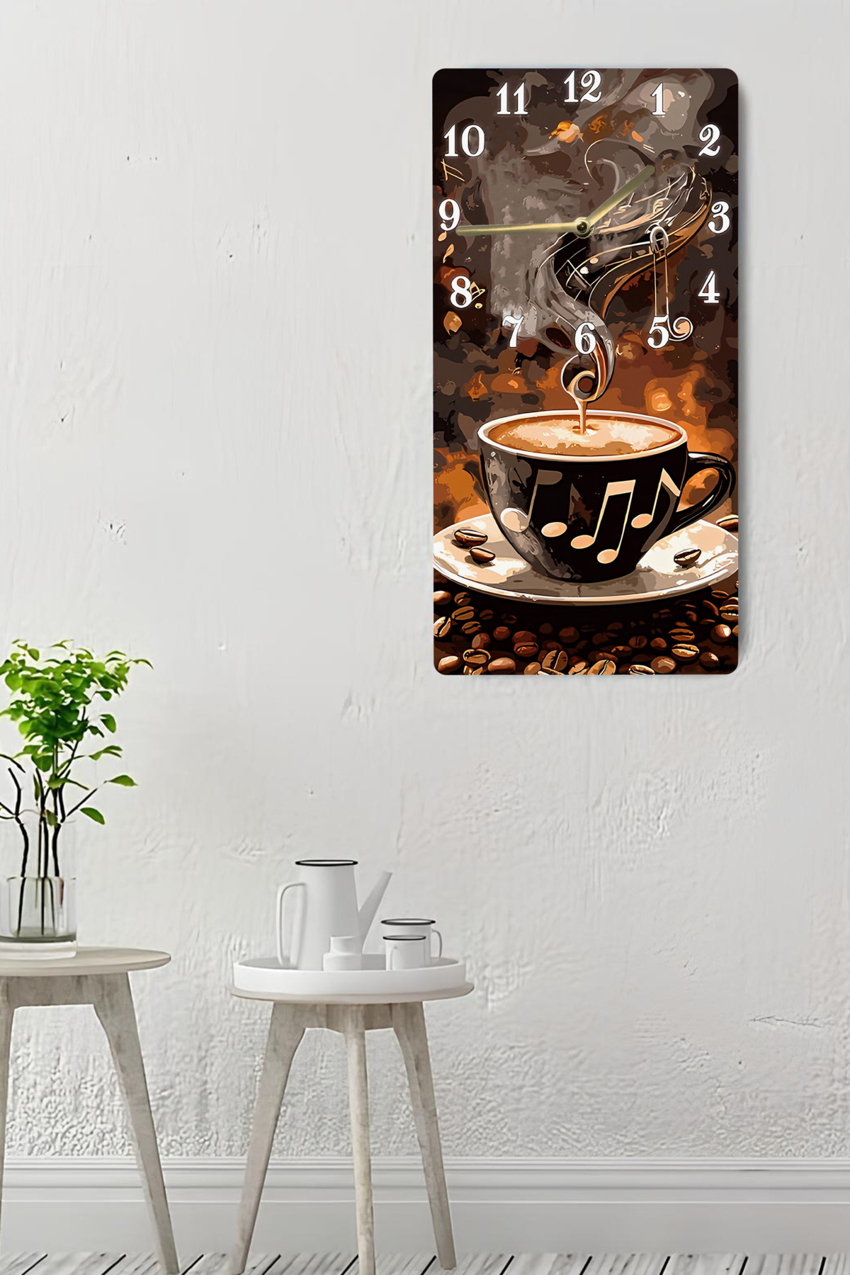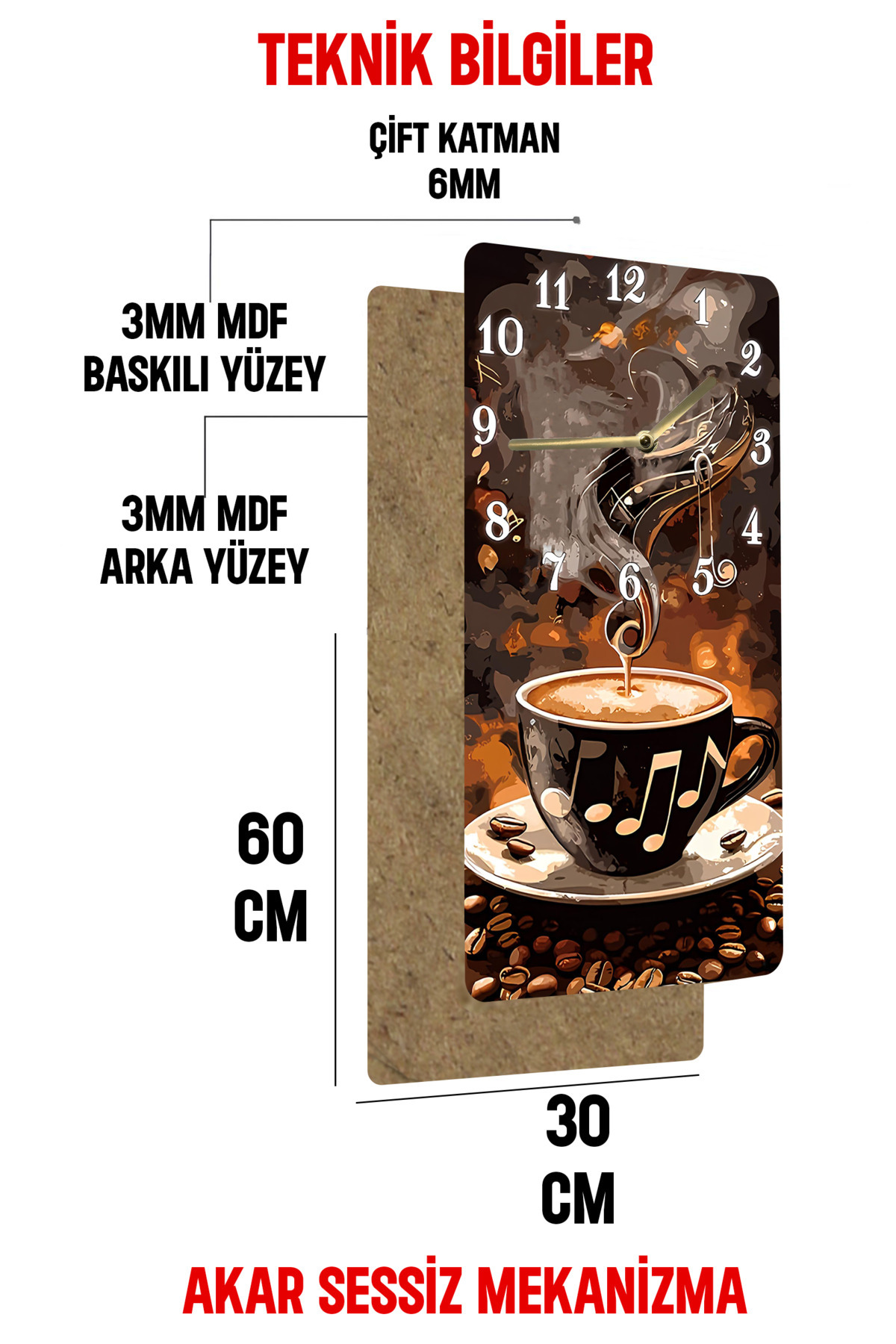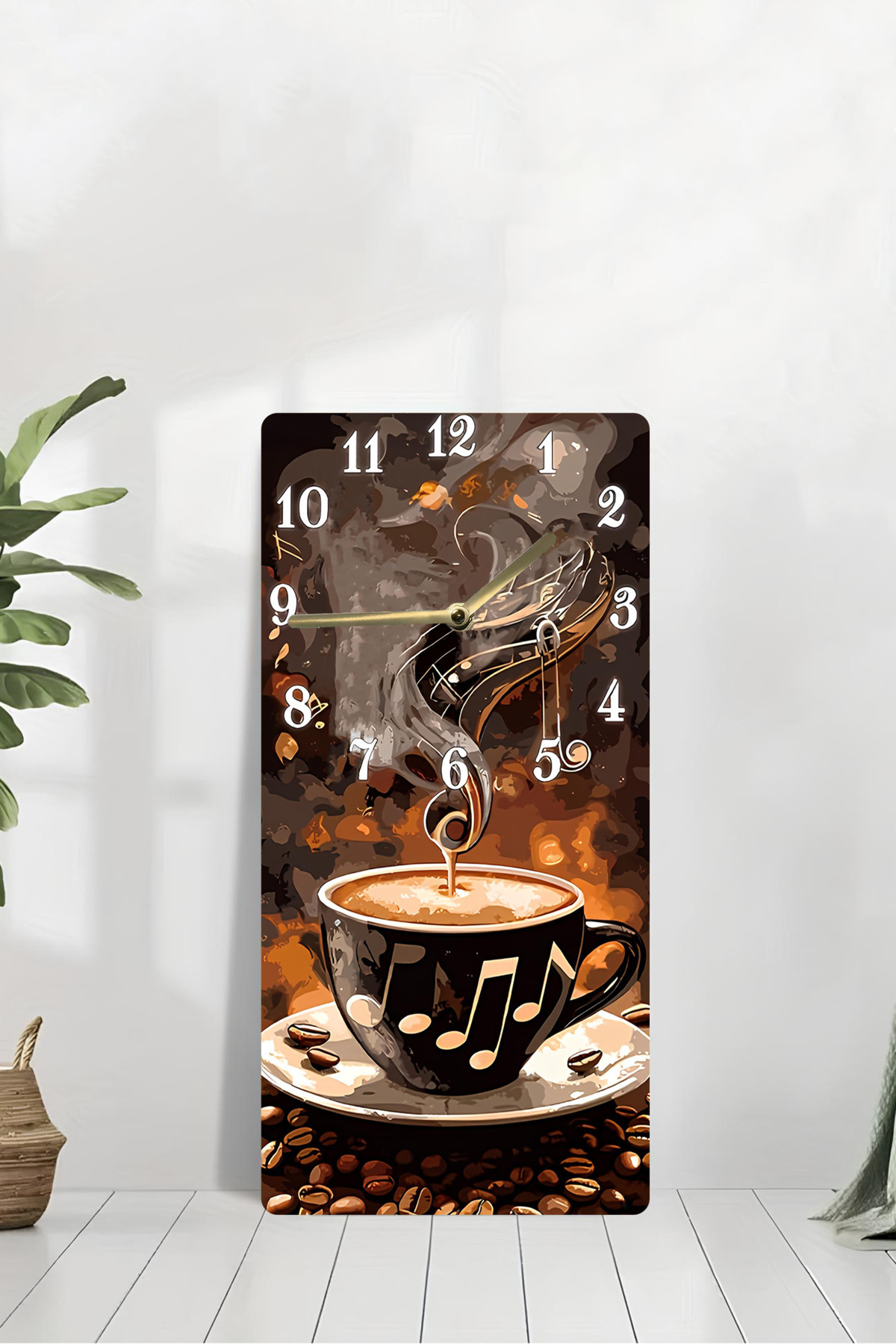MDF Dikdörtgen Kahve & Nota Temalı Dekoratif Duvar Saati – 30x60 UV Baskı – USD014