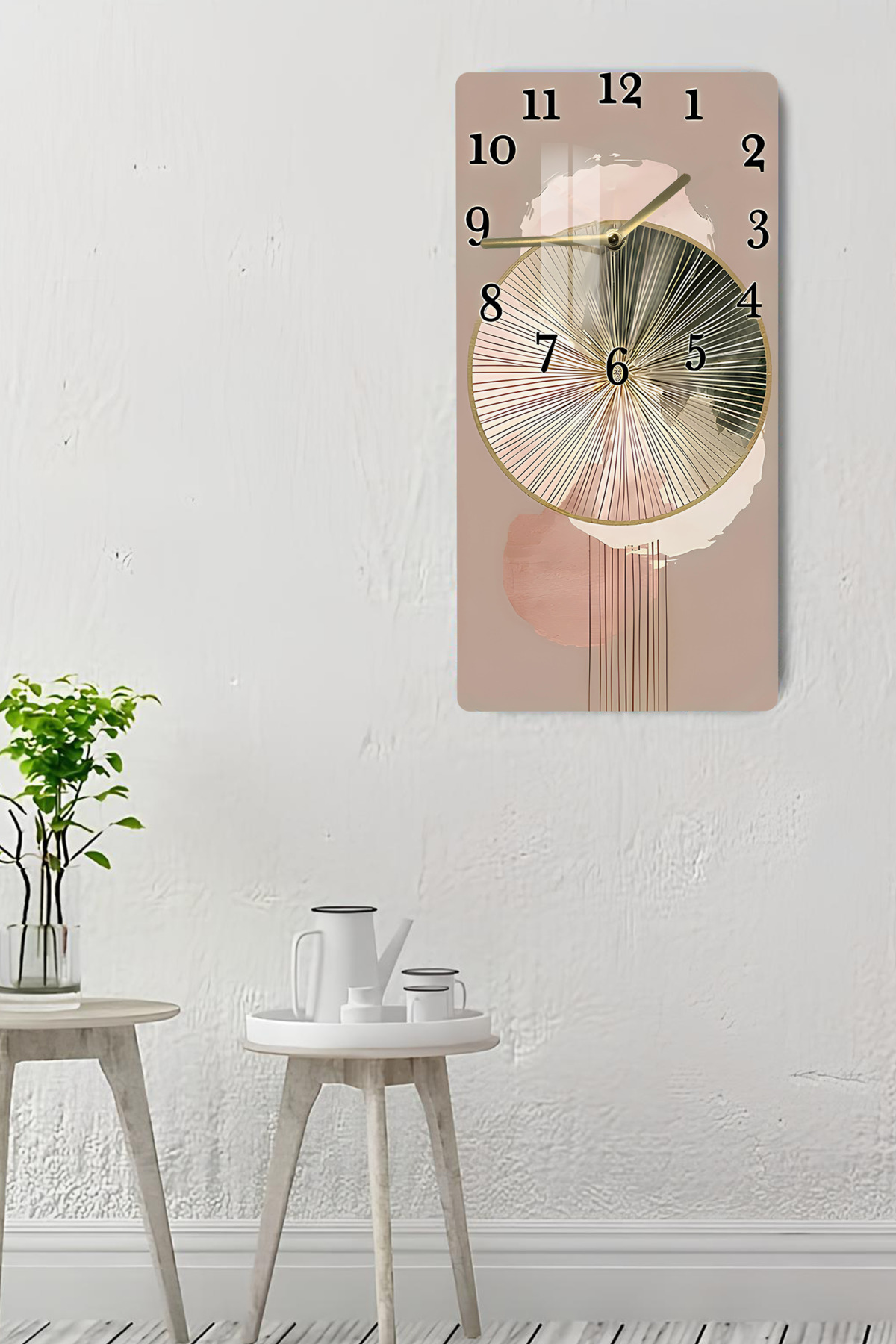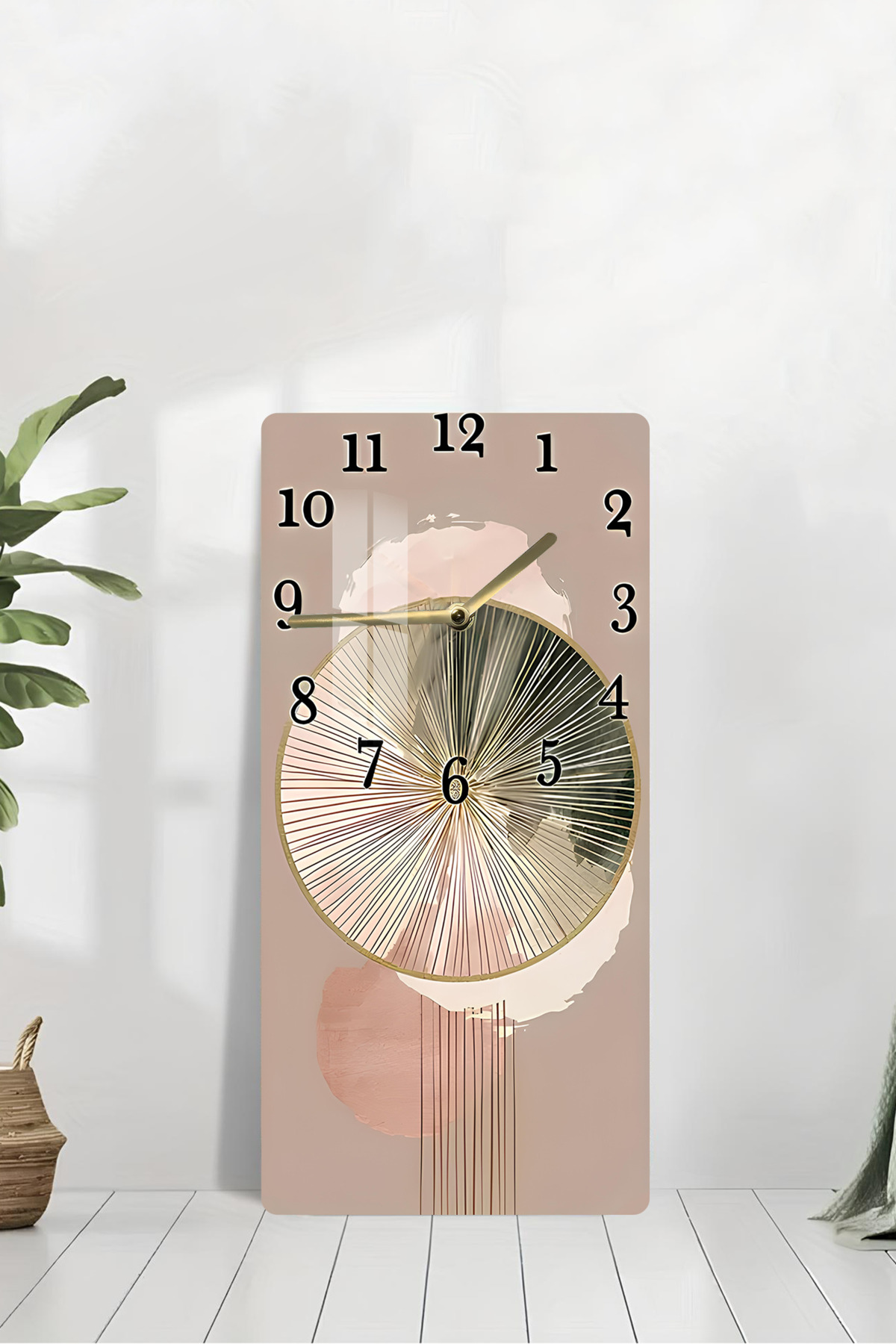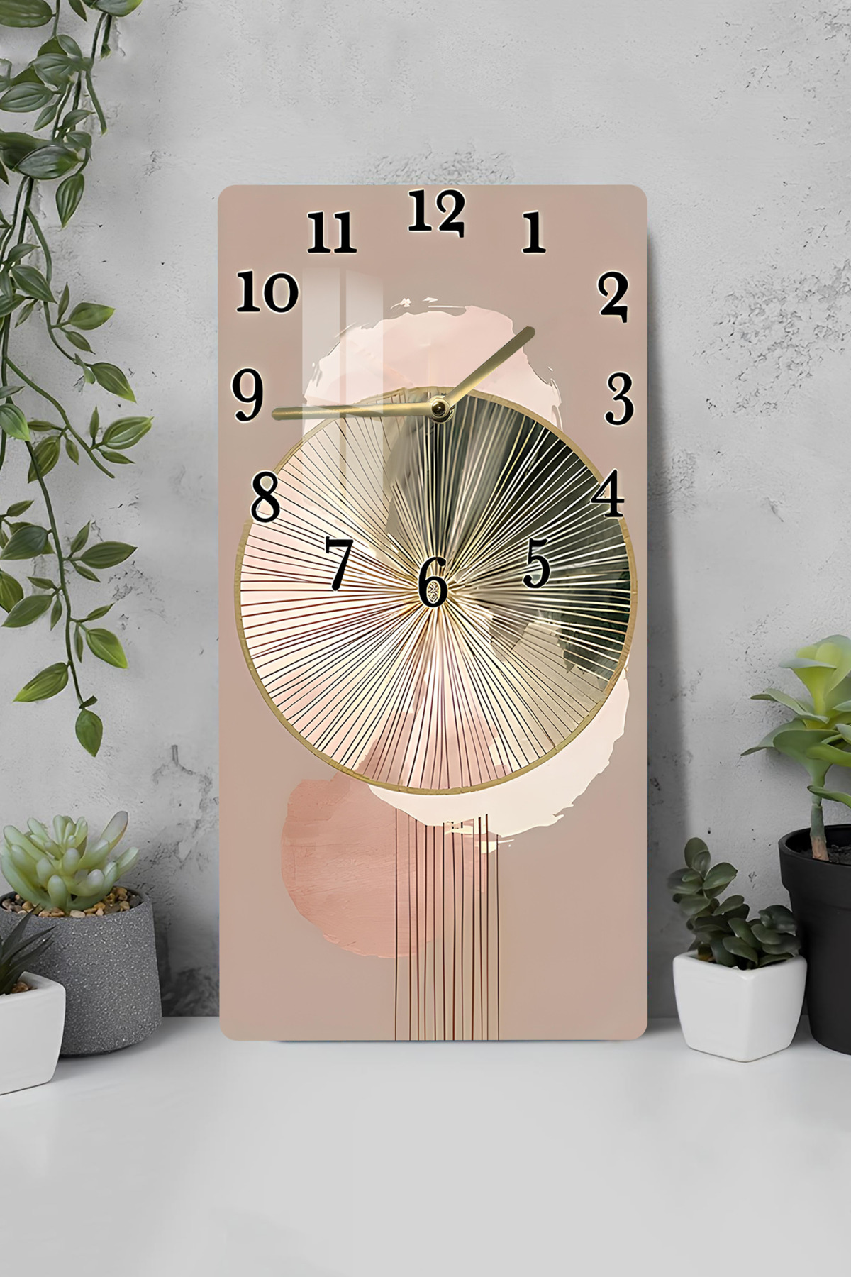 Bej & Gold Soyut Desenli Temperli Cam Tablo Saat – 30X60 cm | HD UV Baskı– CUSD087