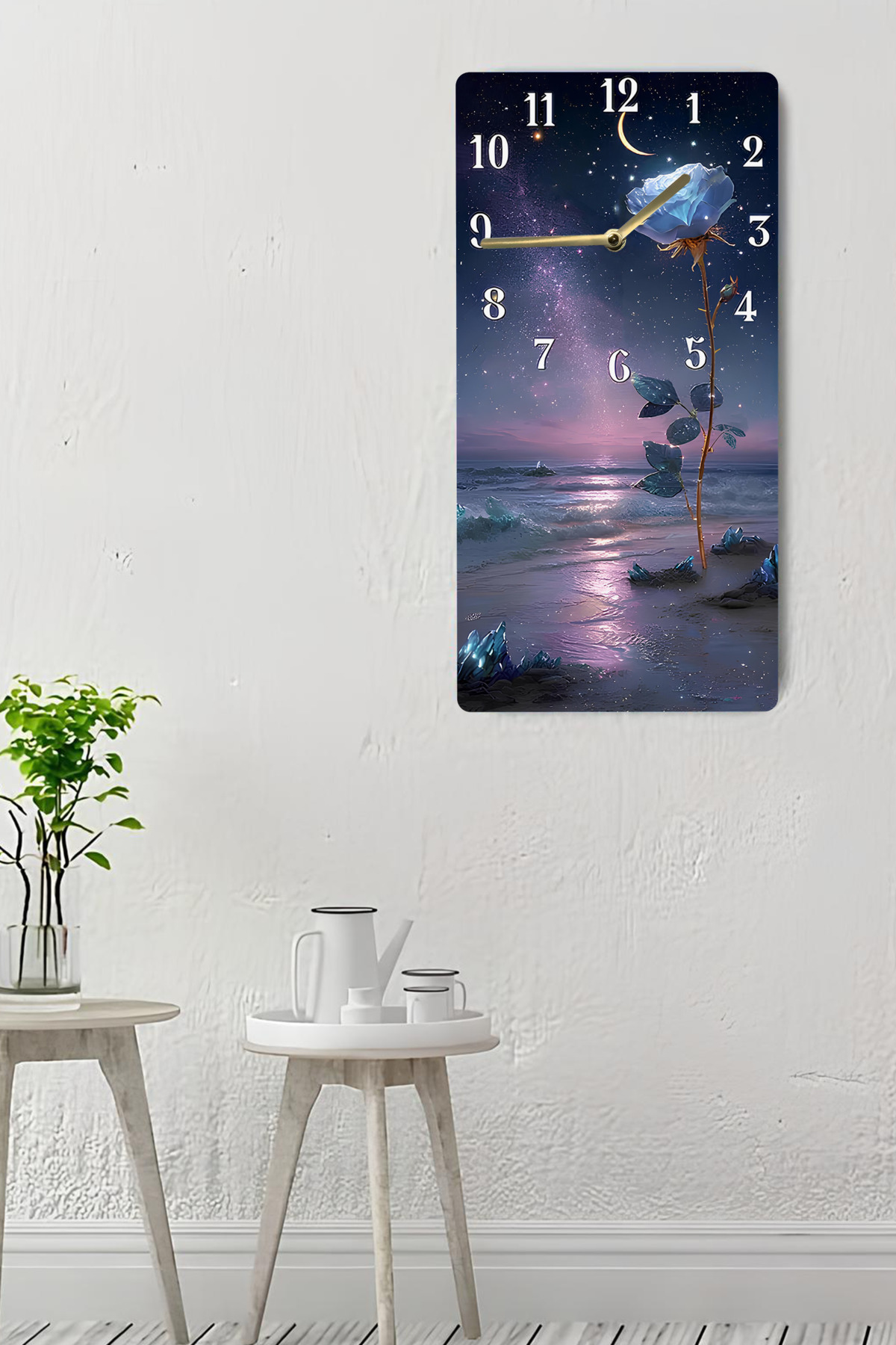 MDF Dikdörtgen Saat – Mavi Gül ve Gece Manzarası Temalı, 30x60 cm– USD085