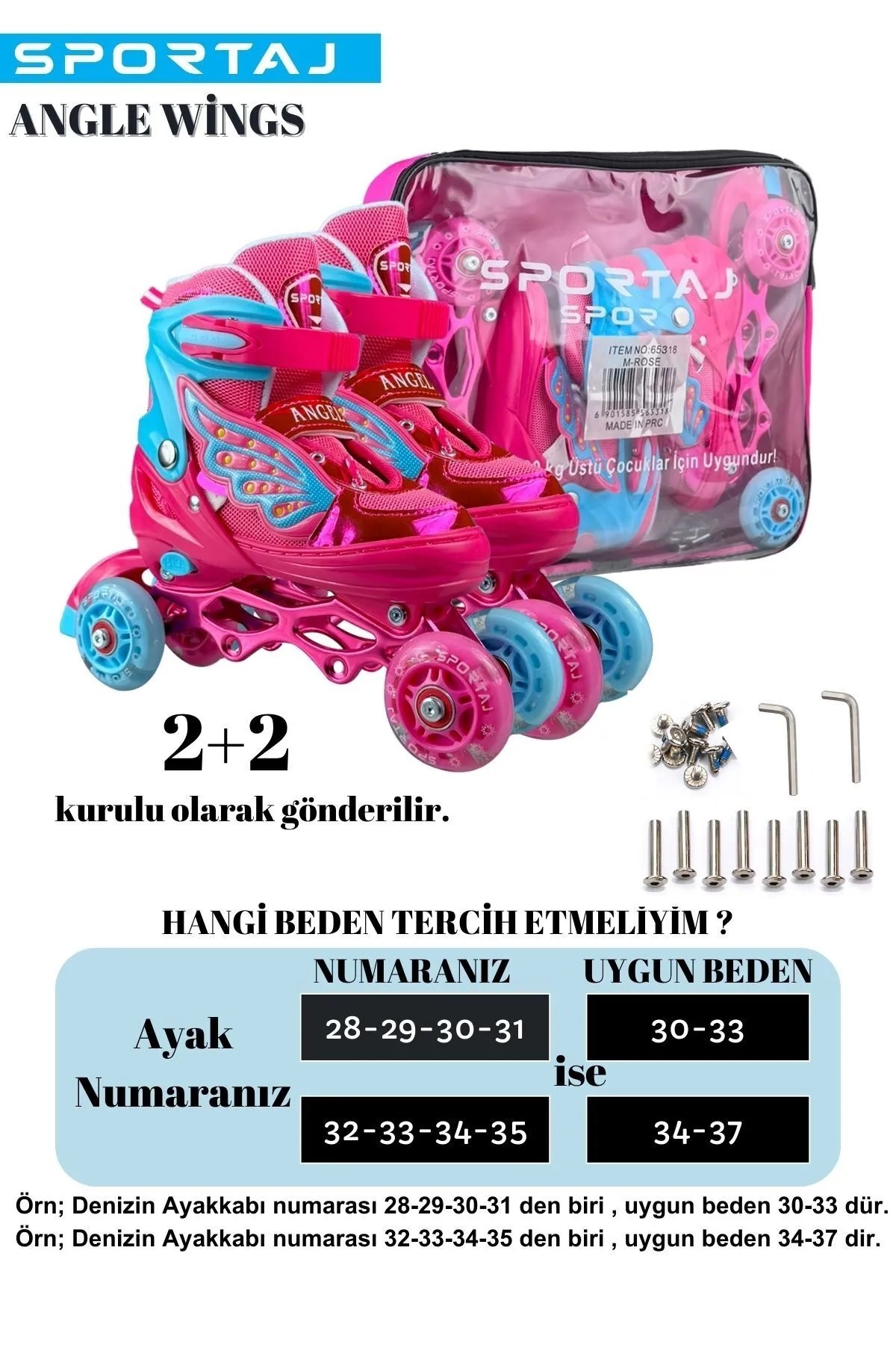 Melek Kanatlı Işıklı Paten 2+2 Kız Çocuk Pateni Silikon Teker,Taşıma Çantalı 3 in 1 Teker