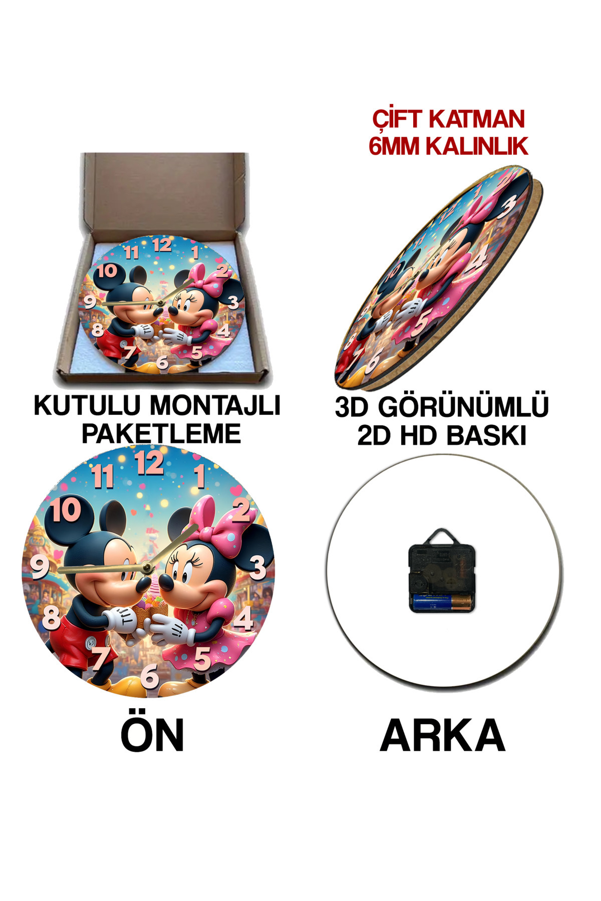 Mickey & Minnie Temalı Renkli MDF Duvar Saati – 3D Görünümlü, Sessiz Mekanizmalı, 2D HD Baskı sdw242