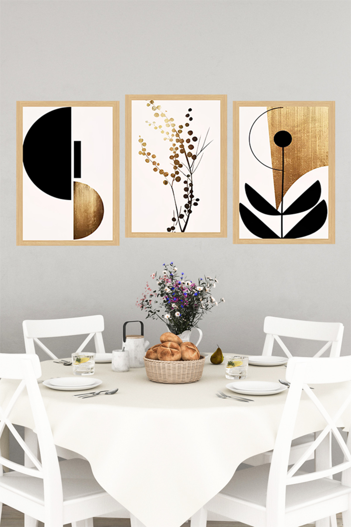 🖼️ Modern Çerçeve Görünümlü 3’lü Tablo Seti – Siyah Altın Geometrik ve Doğal Formlar 🌿✨ CRVS1121