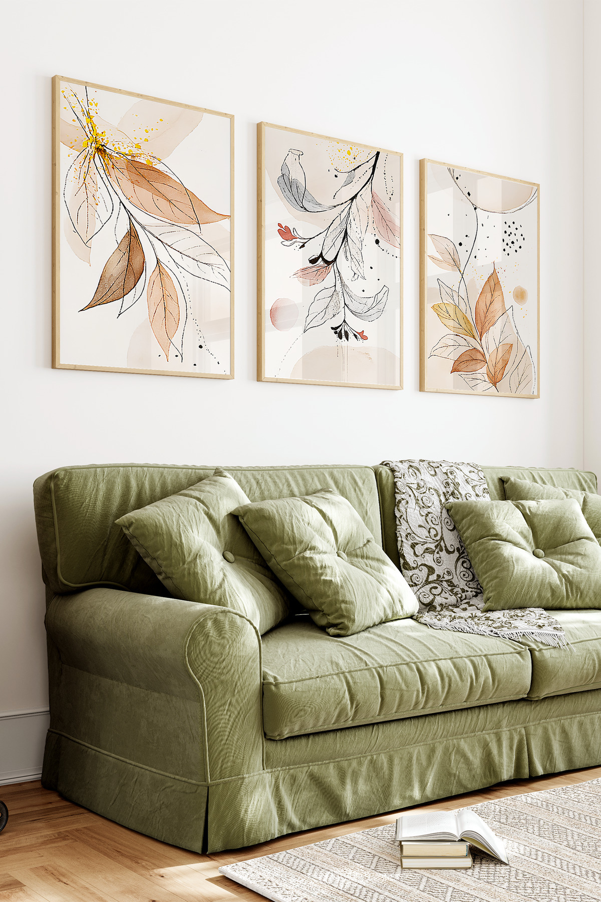🌿 Modern Çizgilerle Doğanın Zarafeti: 3’lü Çerçeveli Dekoratif Tablo Seti - Yaprak Temalı🌿 CRV1174