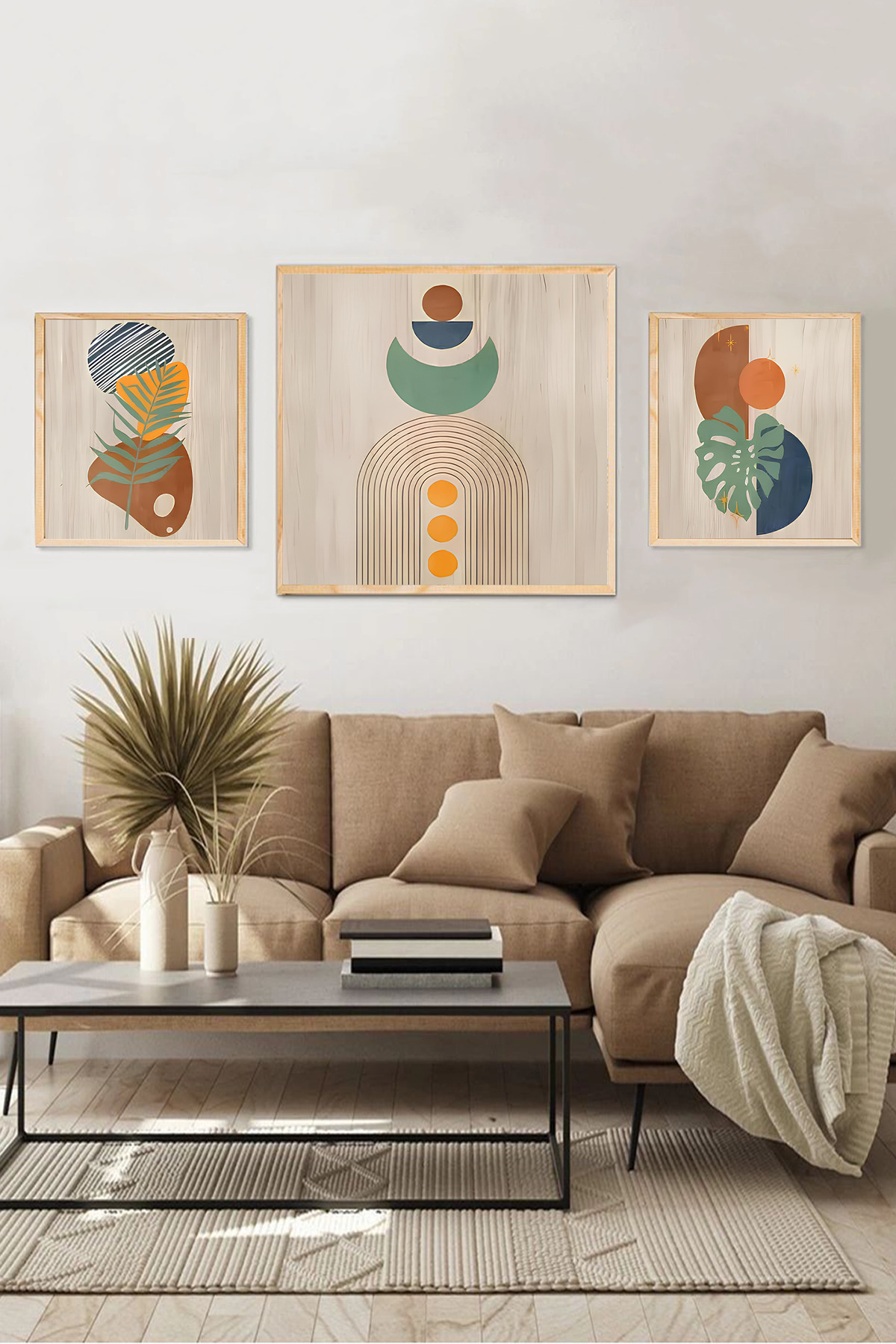 🎨 Modern Geometrik & Bitki Formlu 3’lü MDF Dekoratif Tablo Seti (23x23 cm & 42x42 cm) 4242123