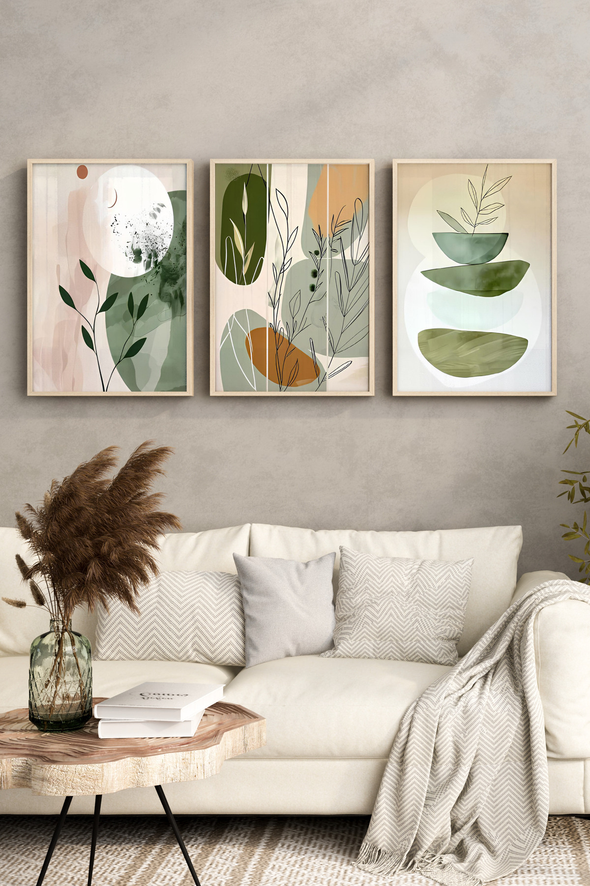 🌿 Modern Yeşil Tonlarında Soyut Bitkiler 3'lü Çerçeveli Tablo Seti CRV1043
