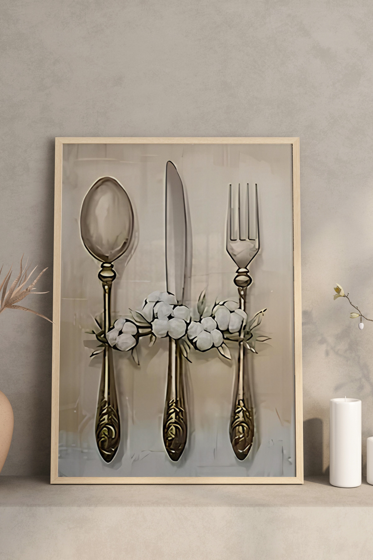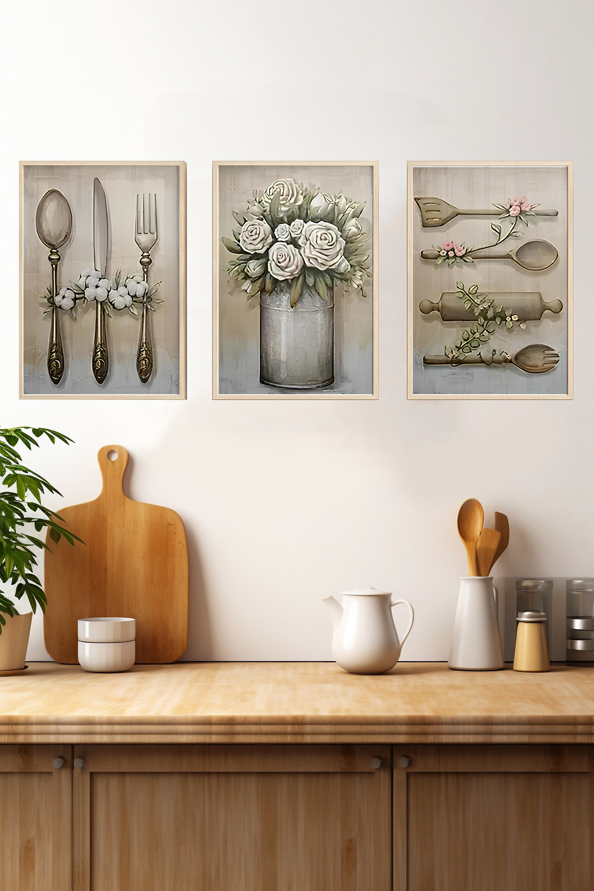 🌸 Mutfak Gereçleri ve Çiçek Temalı 3’lü Çerçeveli Dekoratif Tablo Seti 🌸 CRV1063