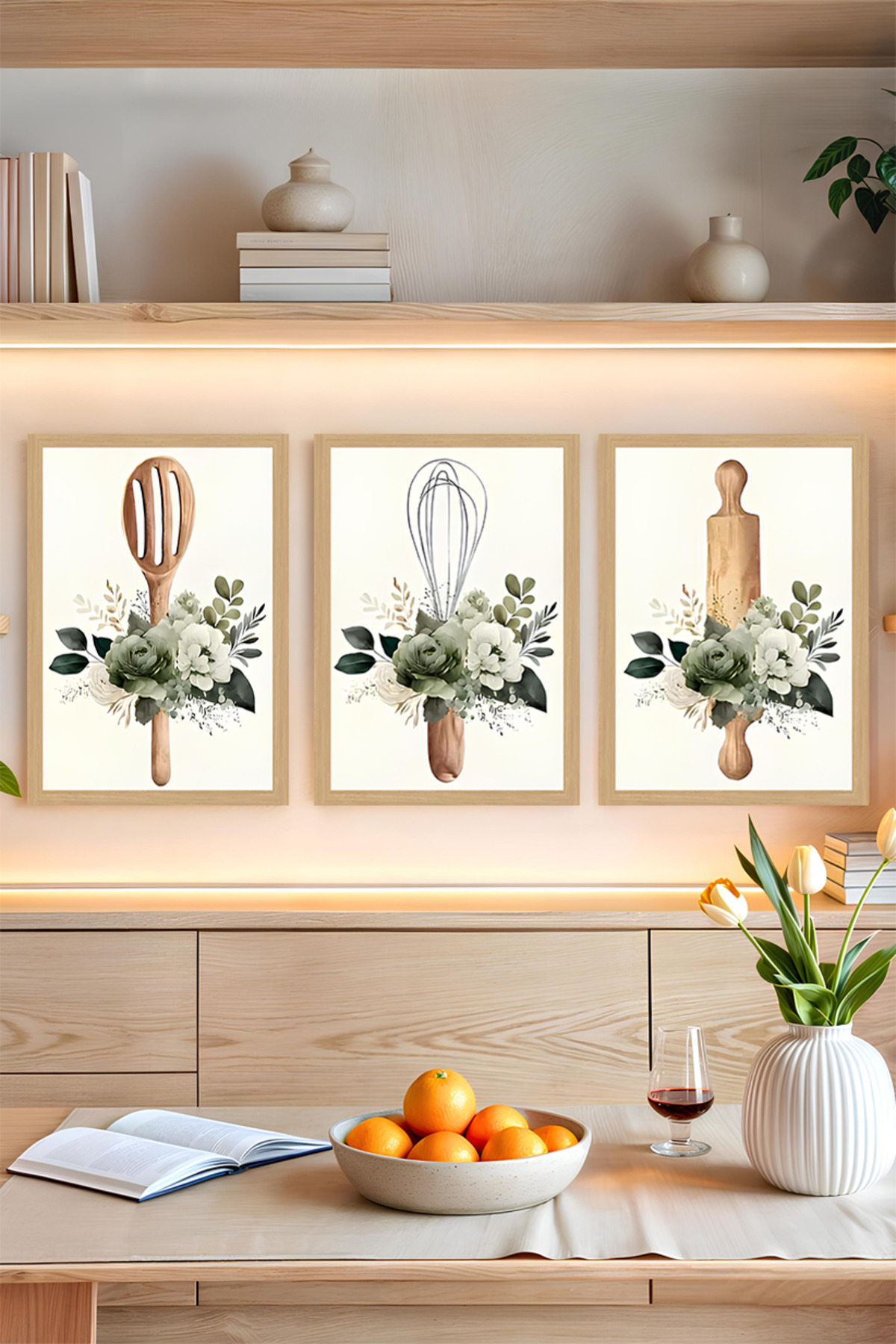 🥄 Mutfak Temalı 3'lü Çerçevesiz Tablo Seti – Ahşap Aksesuarlar ve Çiçek Armonisi 🍃 CRVS1047