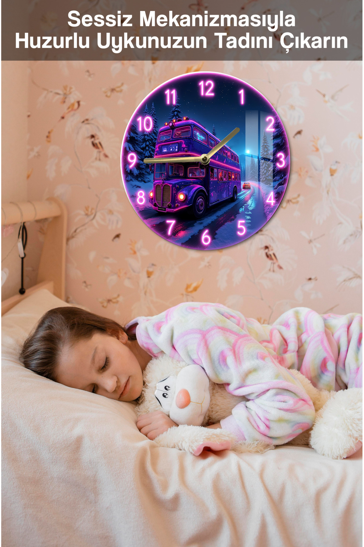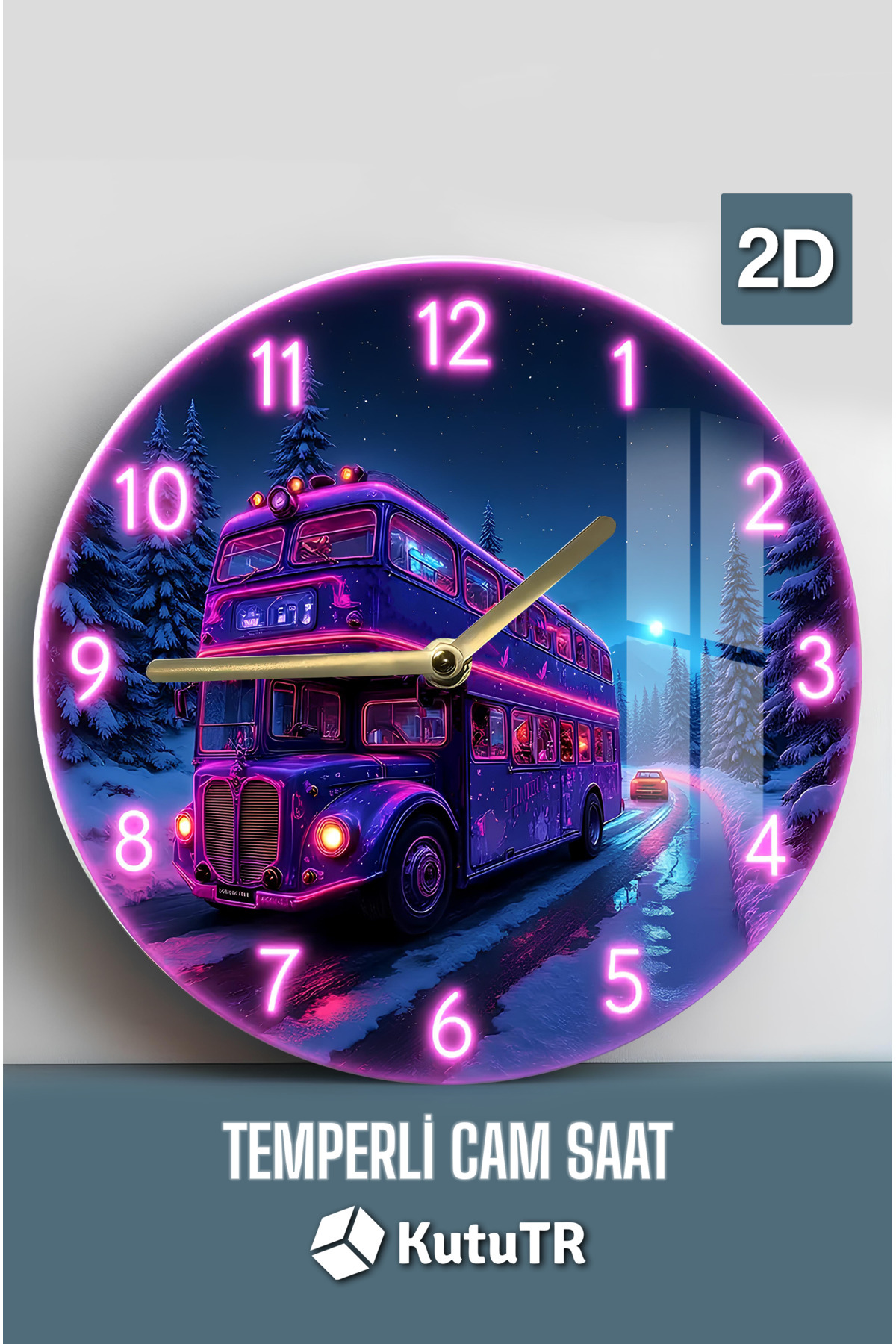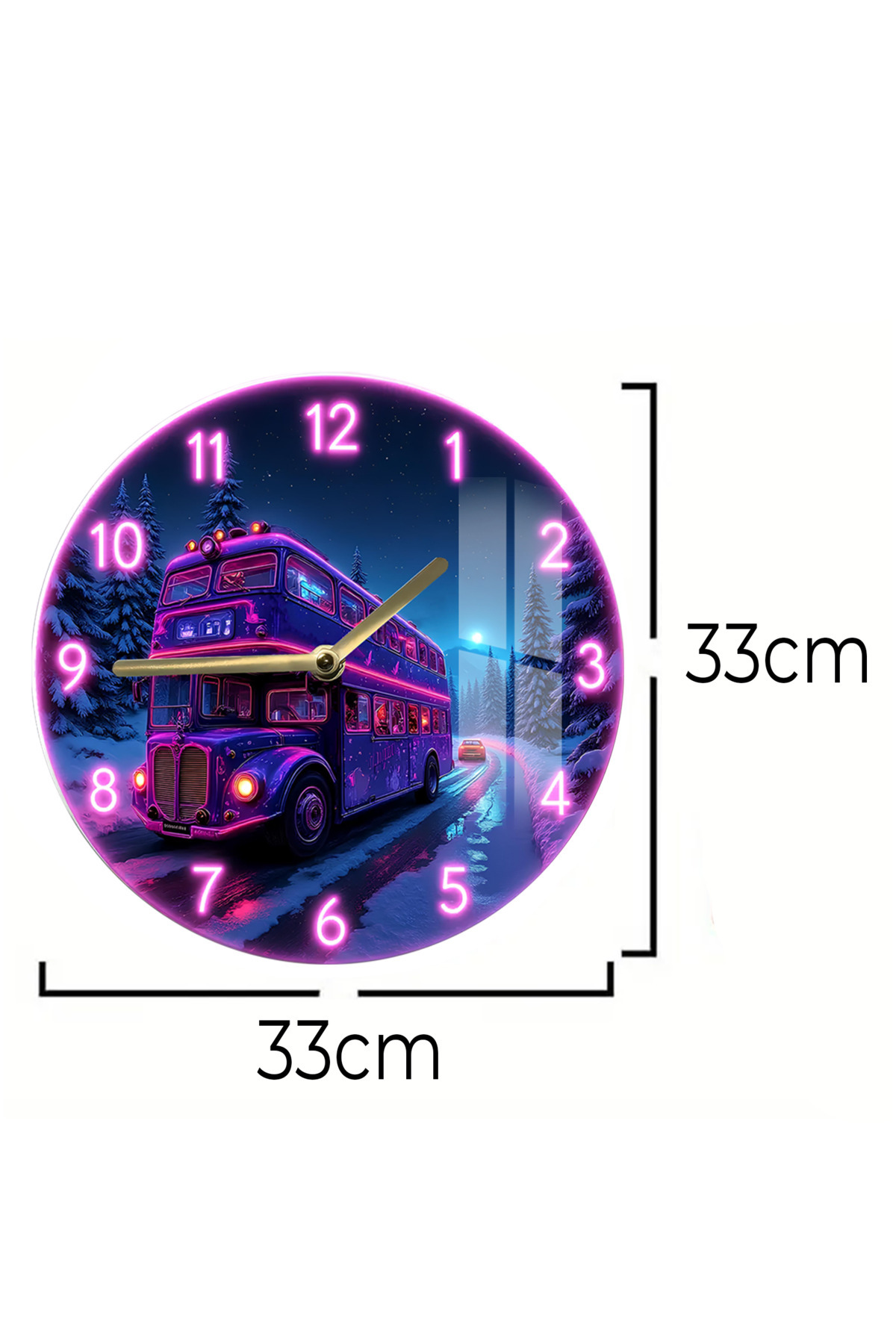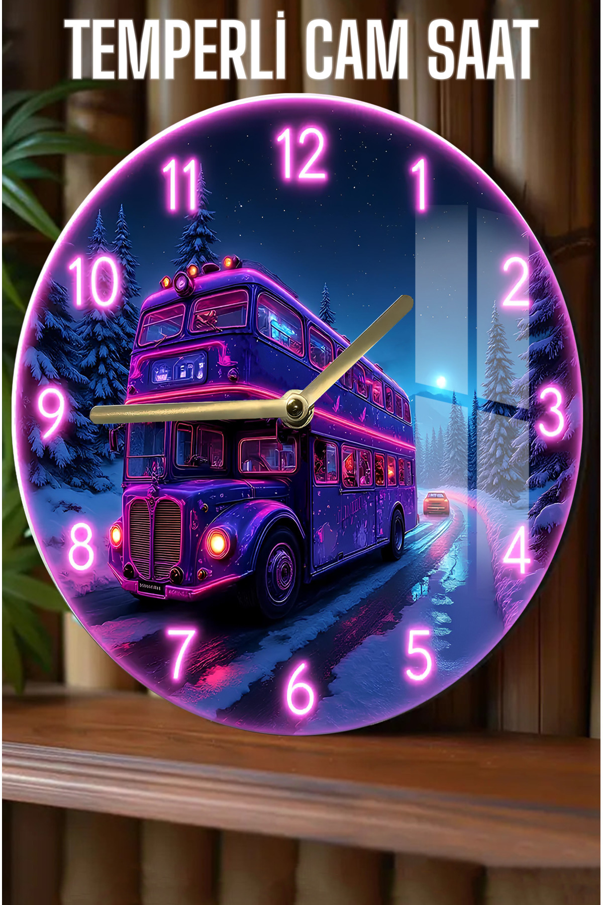 NEON OTOBÜS TEMALI TEMPERLİ CAM SAAT - 33x33 CM CSDW026