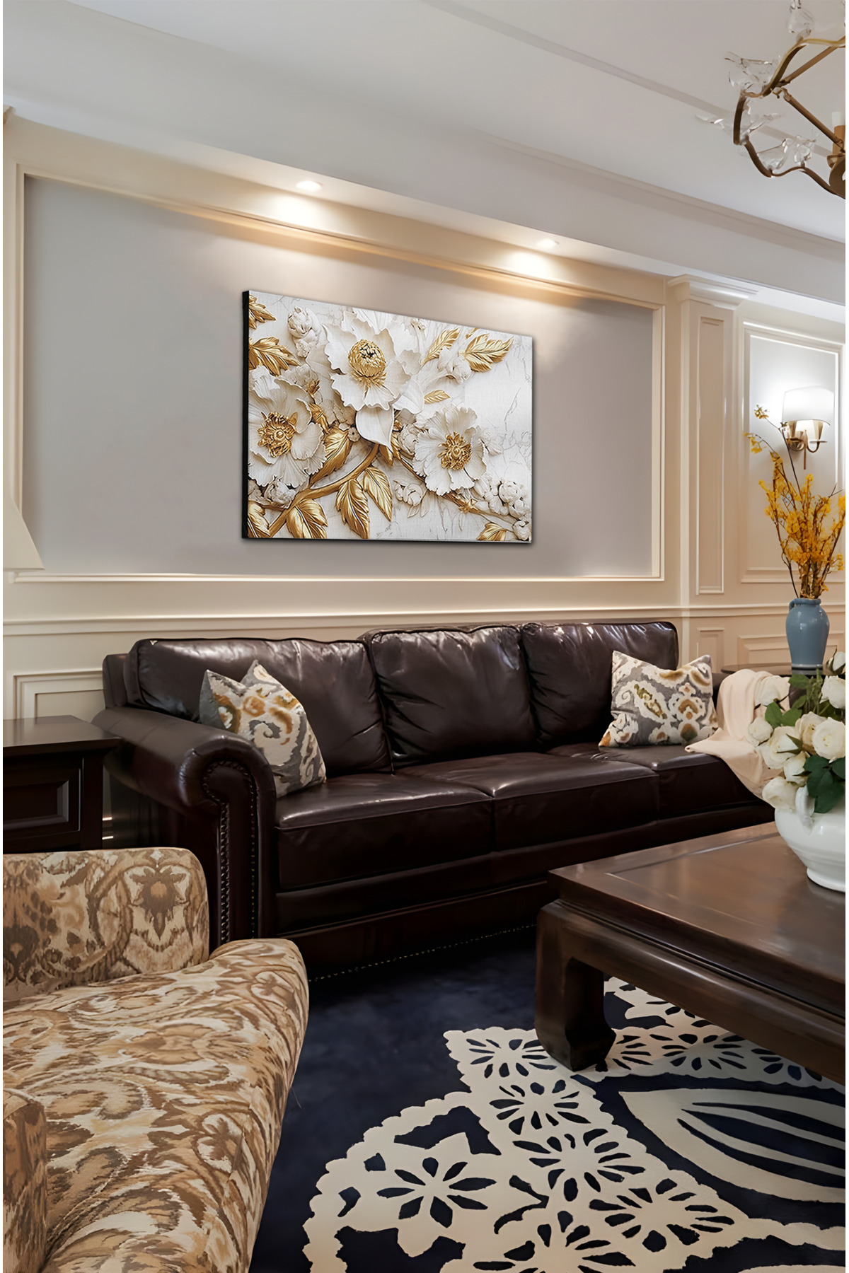 Notpa Altın Çiçek Desenli 3D Görünümlü Kanvas Tablo