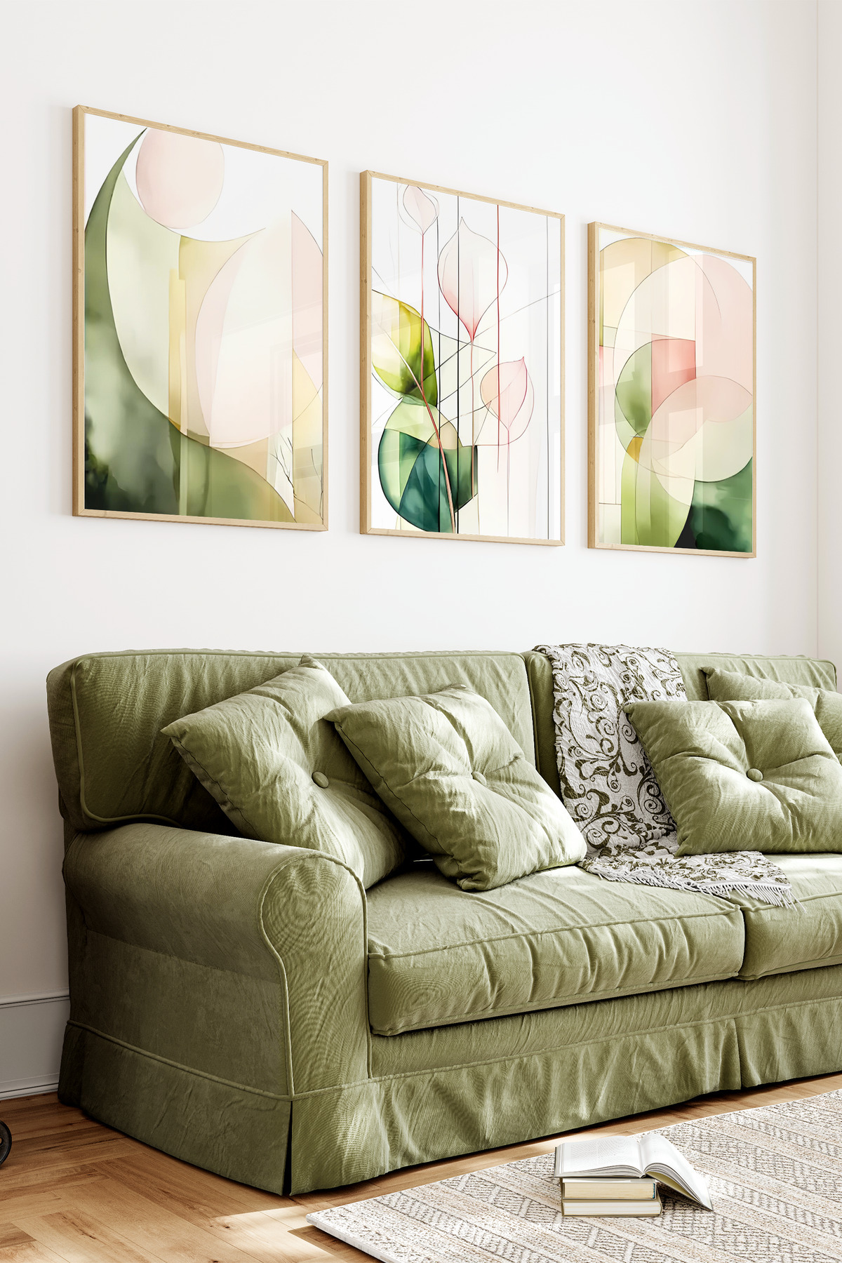 🌿 Pastel Yeşil ve Pembe Tonlarda 3’lü Modern Çerçeveli Tablo Seti🌿 CRV1123