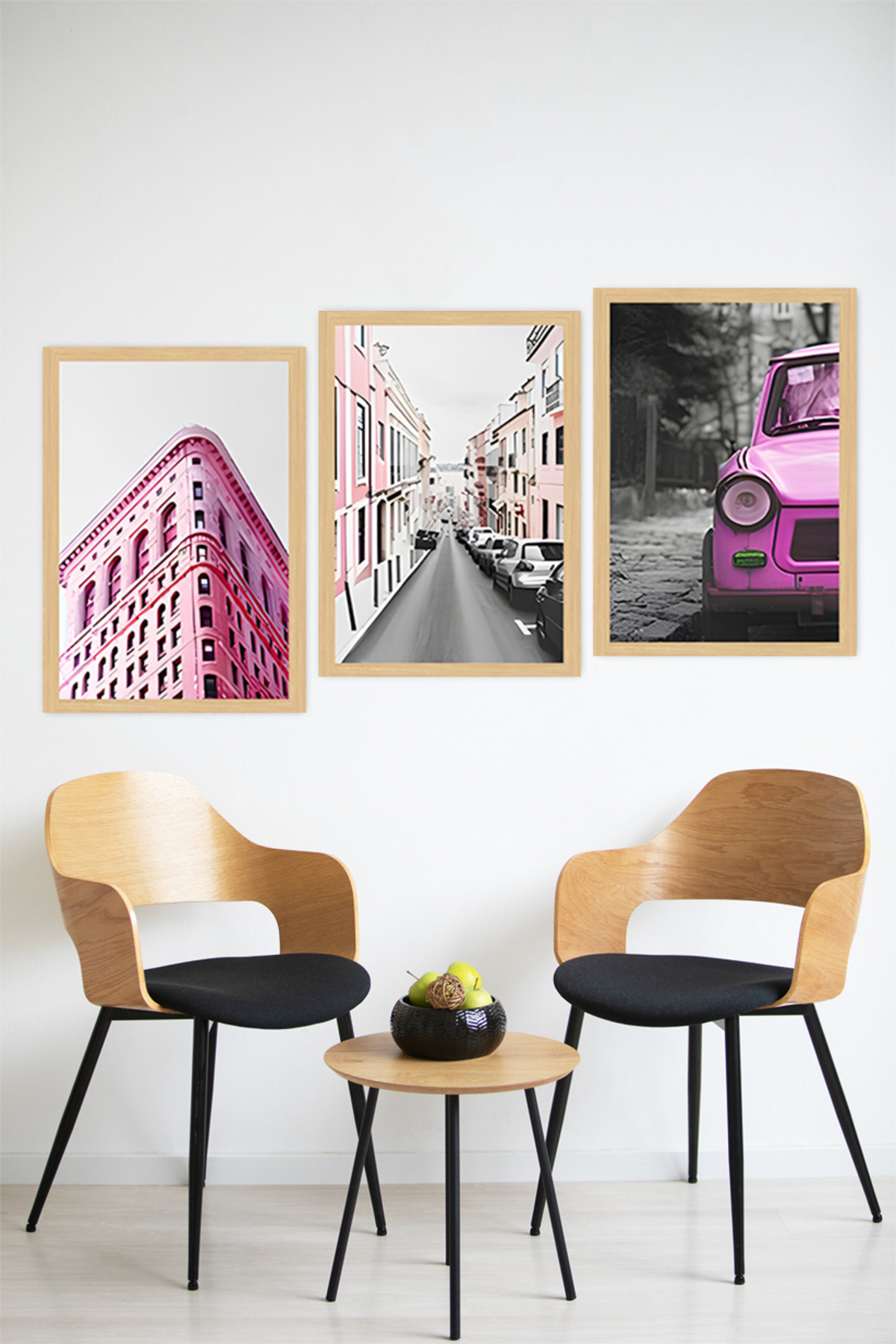 🌆 Pembe Şehir Temalı 3’lü Çerçeve Görünümlü Tablo Seti – Modern Dekorun Renkli Yorumu🌟 CRVS1175