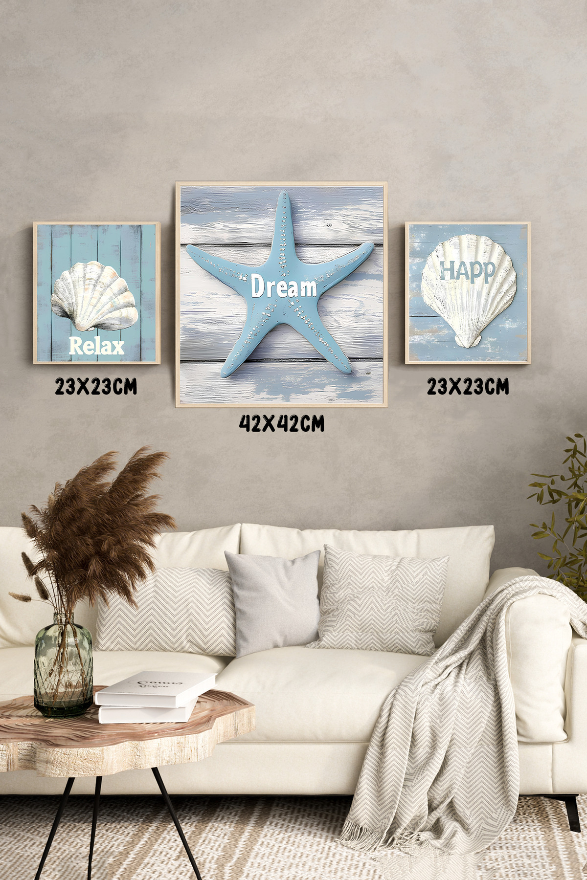 🐚 Relax - Dream - Happy Temalı 3'lü MDF Duvar Tablo Seti (23x23 cm & 42x42 cm) 4242113