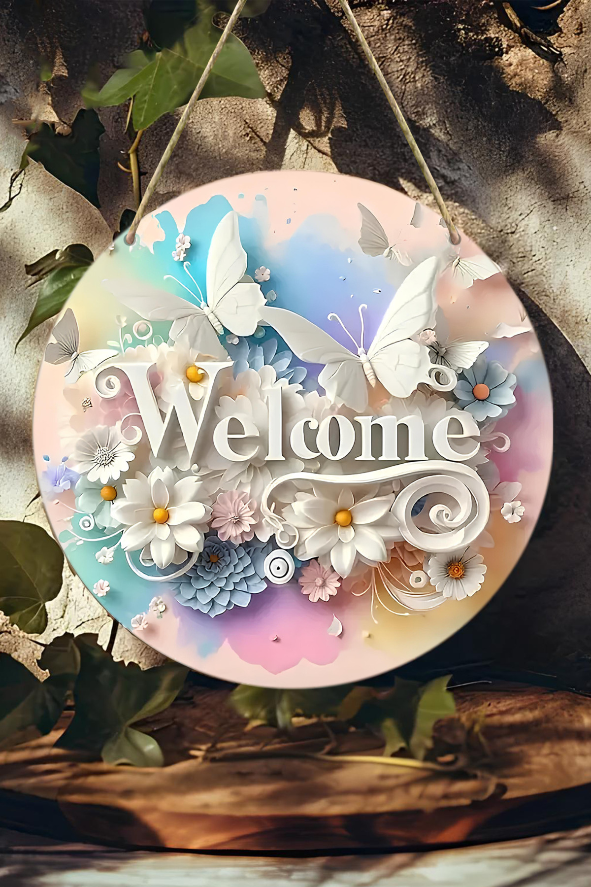 🌸 Rengârenk Çiçek ve Kelebek Temalı MDF Kapı Süsü – Welcome Yazılı 🌸KS009