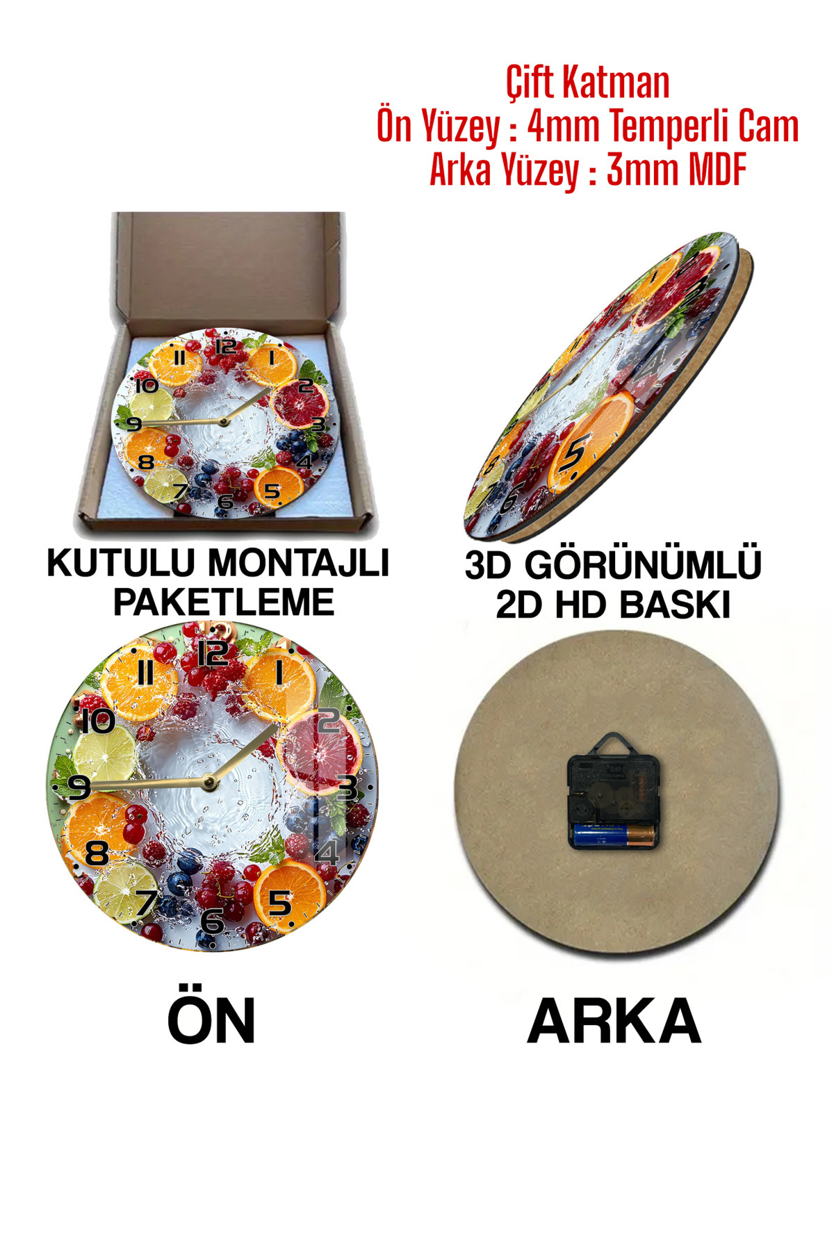 RENKLİ MEYVELER DESENLİ 3D Görünümlü Temperli Cam Saat – 33 cm CSDW349