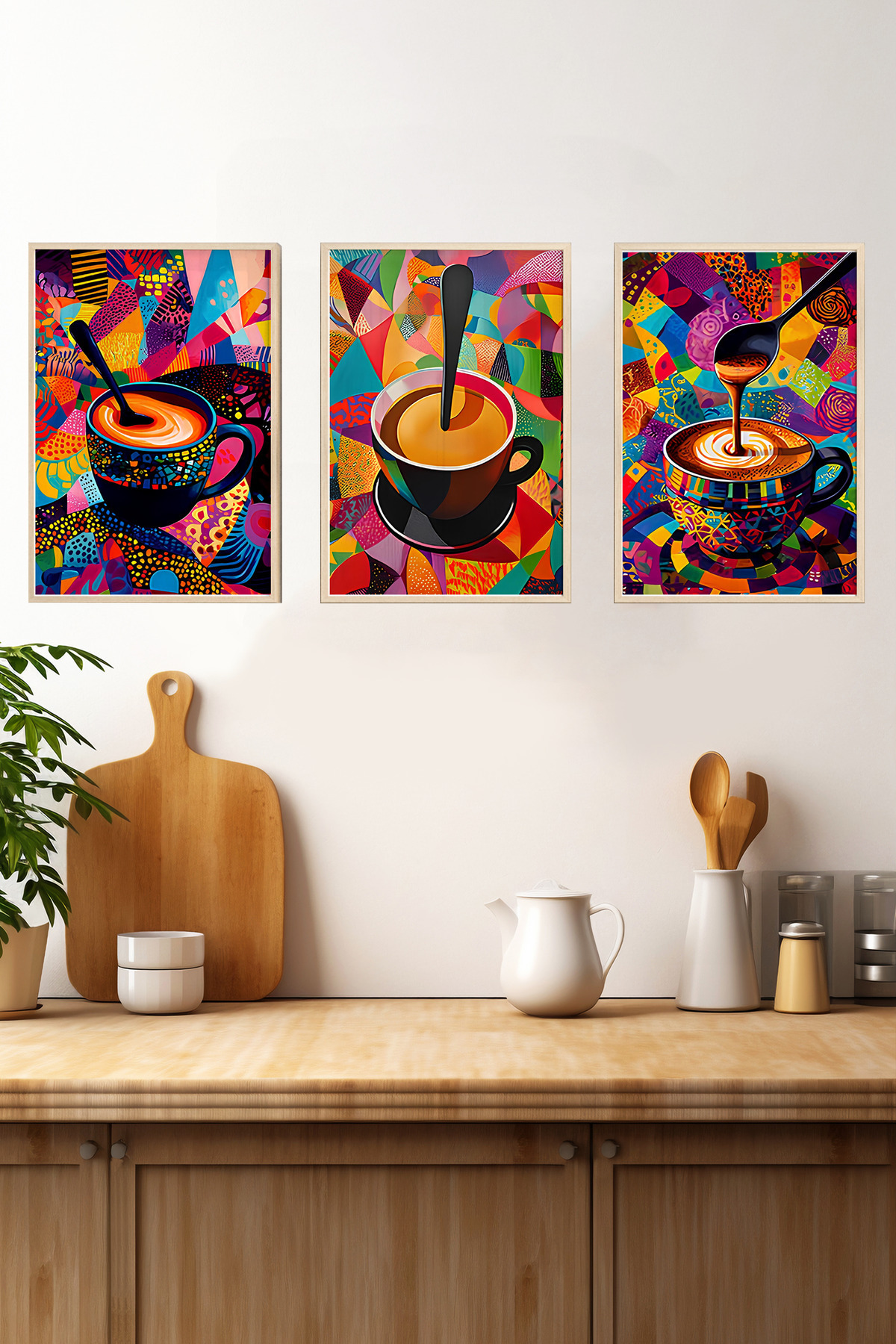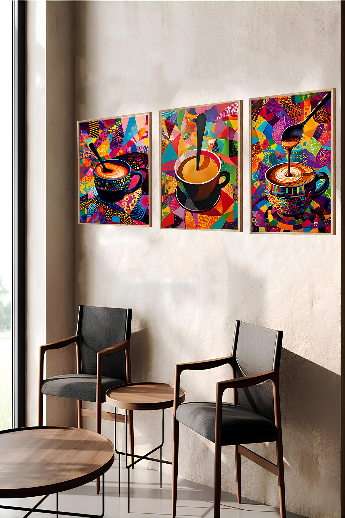 ☕ Renkli Soyut Kahve Temalı Ahşap Çerçeveli 3’lü Tablo Seti – MDF Üzerine UV Baskılı CRV1018
