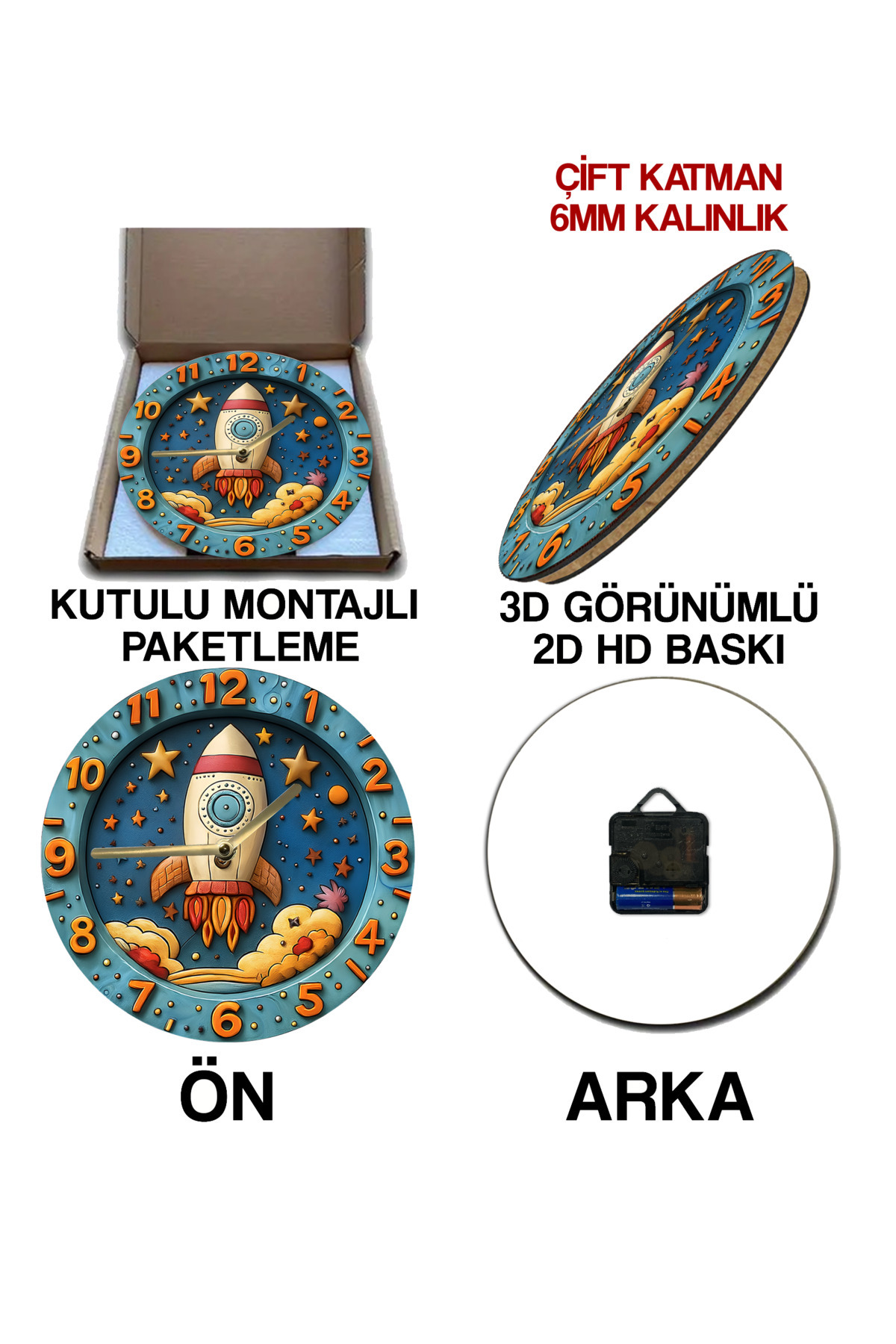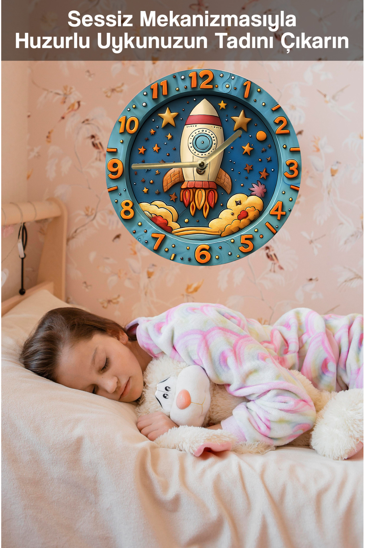 Roket ve Uzay Temalı Çocuk MDF Duvar Saati – 3D Görünümlü, 2D HD Baskı, Sessiz Mekanizma sdw236
