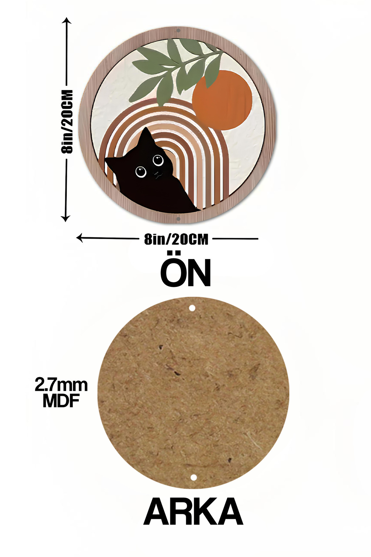 🎨 Sevimli Siyah Kedi Desenli Yuvarlak Ahşap Duvar Süsü – 20x20 cm 🐾🌈🌸 DT040