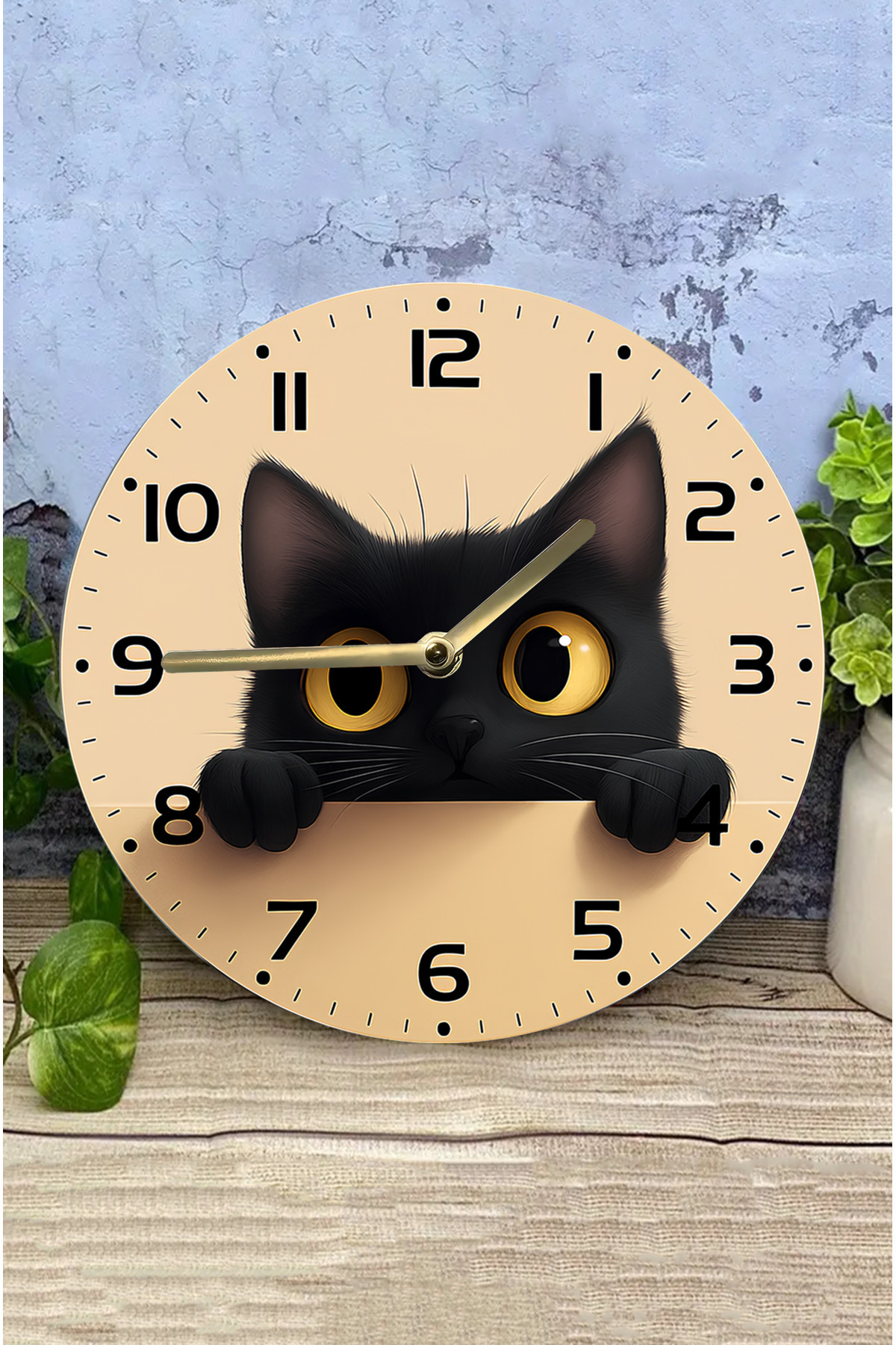 Şirin Bakışlara Zaman Ayırın – 3D Görünümlü Siyah Kedi MDF Duvar Saati sdw229