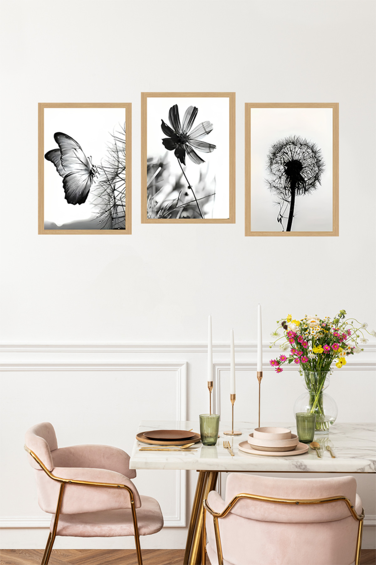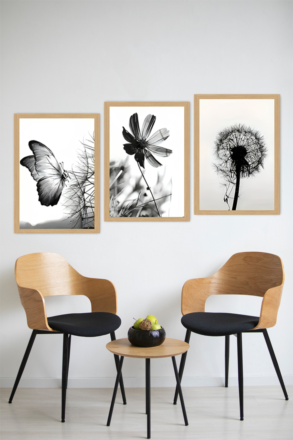 🖤 Siyah Beyaz Kelebek ve Çiçek Temalı 3'lü UV Baskılı Tablo Seti (Çerçevesiz) CRVS1060