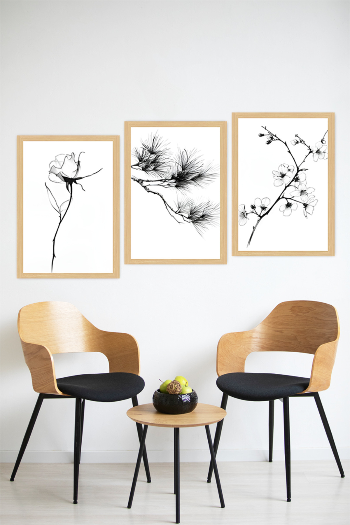 🖼️ Siyah Beyaz Minimal Çiçek ve Dal Temalı 3'lü Çerçeve Görünümlü Tablo Seti 🌟 CRVS1103