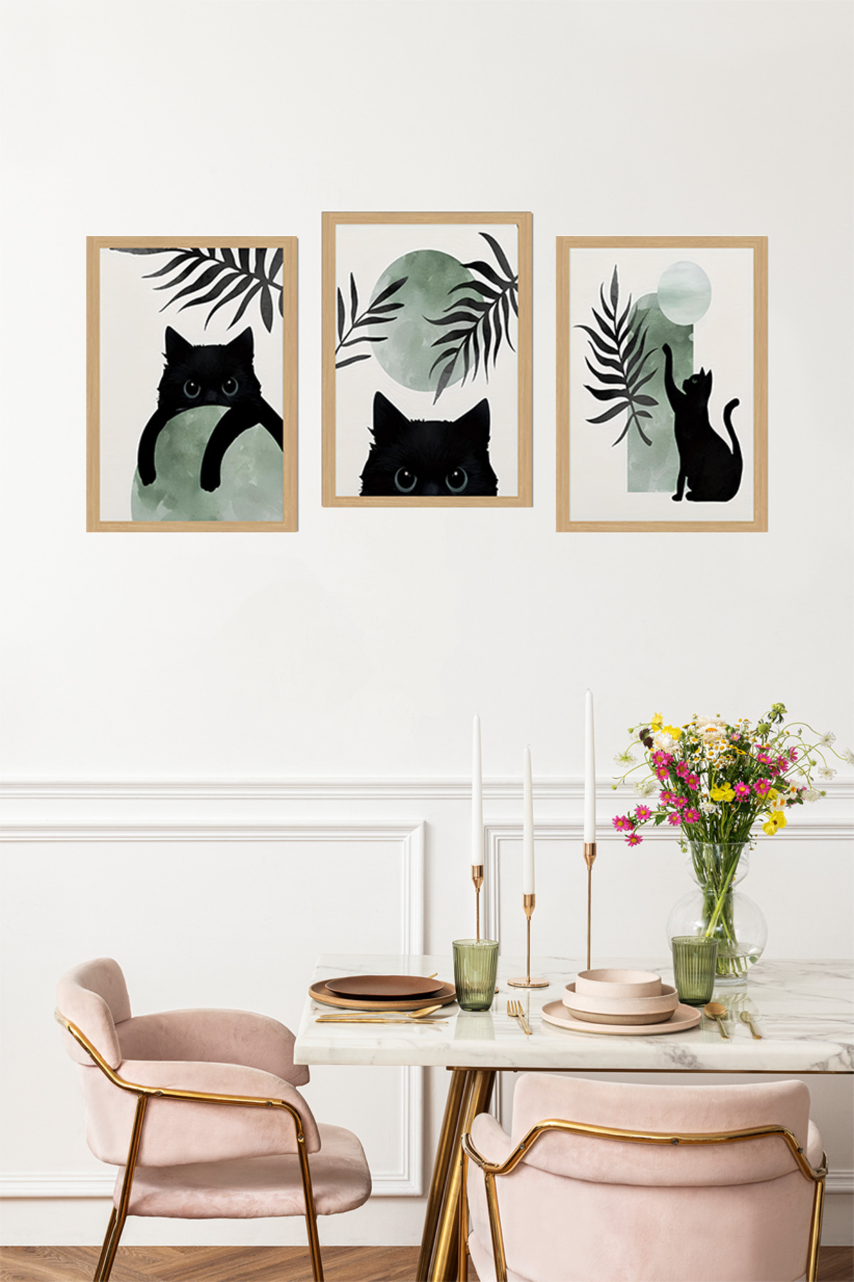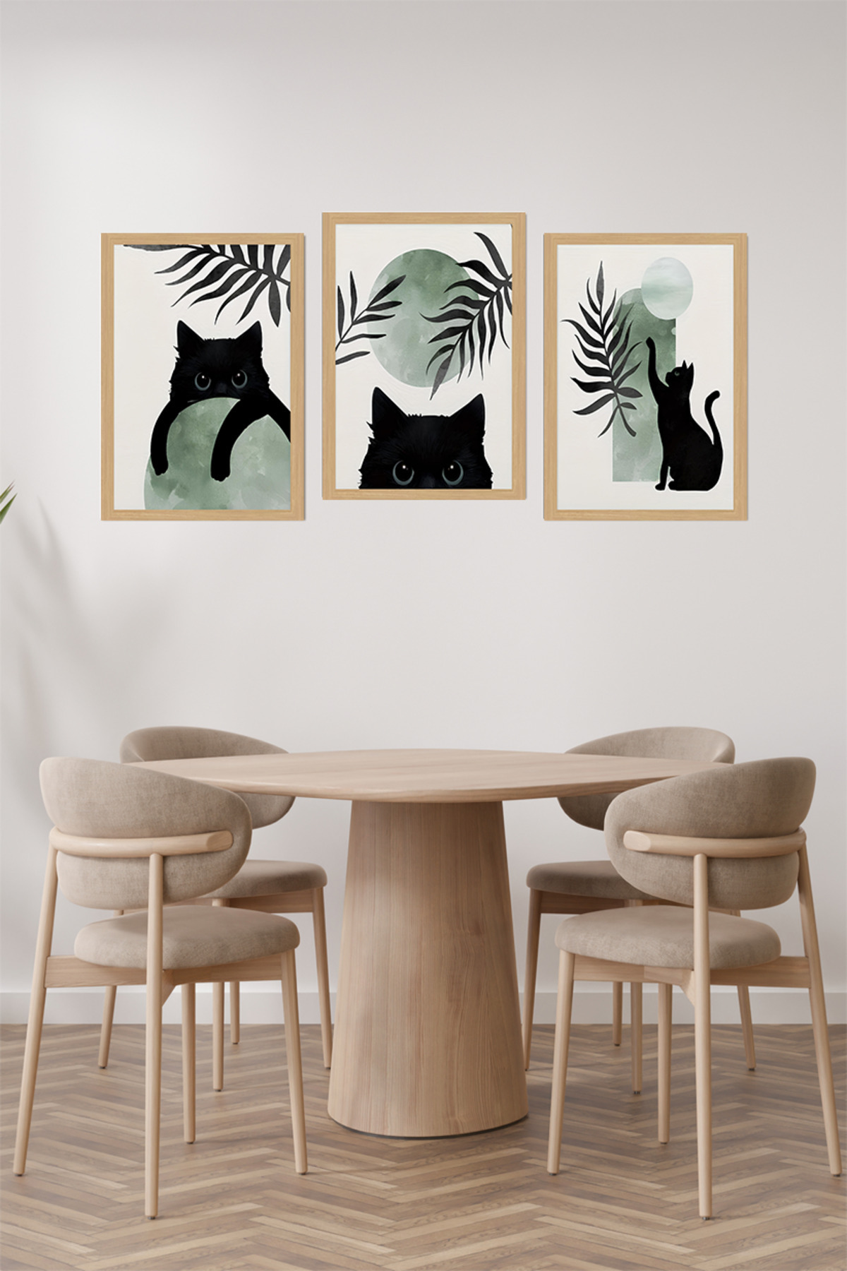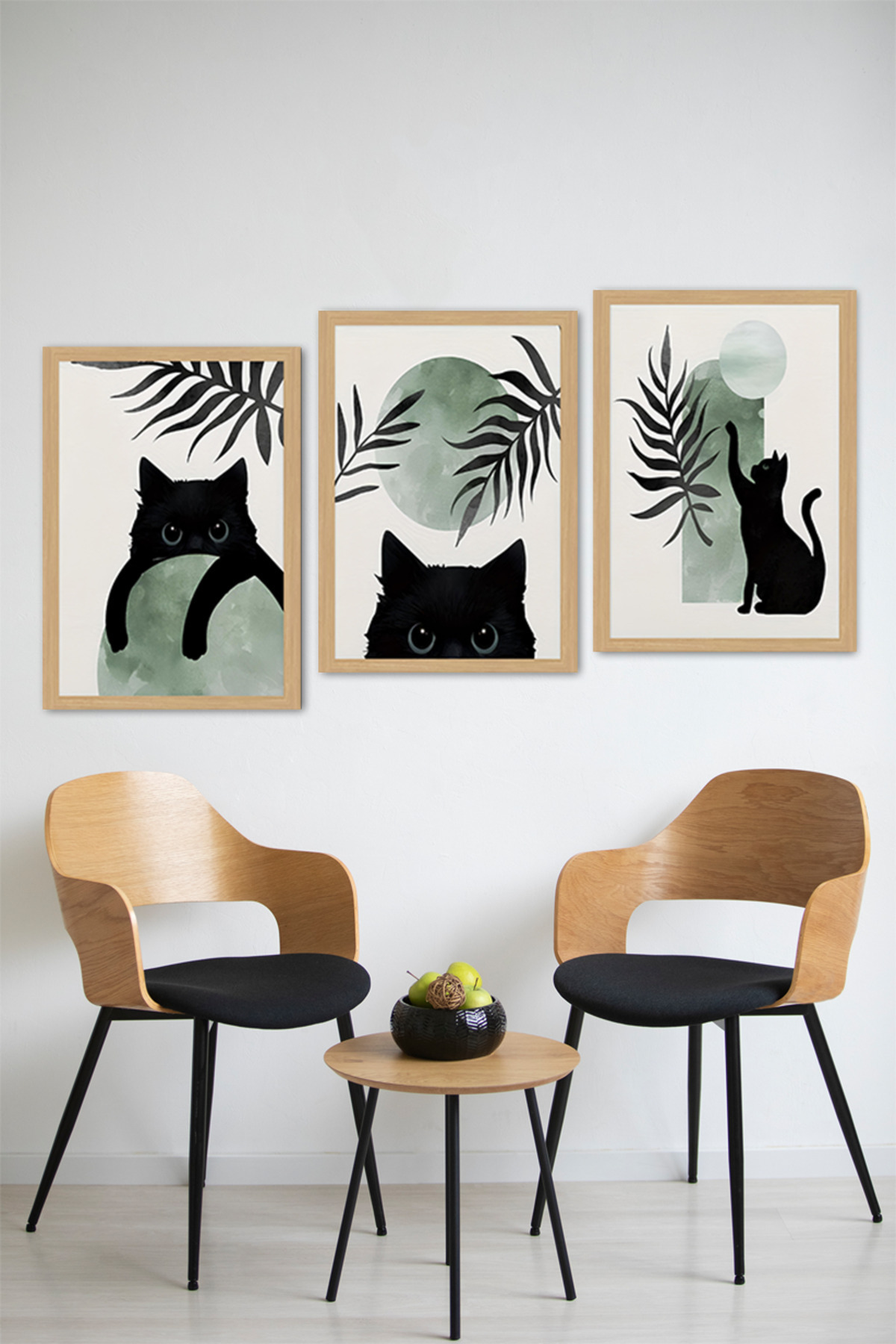 🐈⬛ Siyah Kedi Temalı Yeşil Geometrik 3’lü Çerçevesiz Tablo Seti – UV Baskılı 🌿 CRVS1036