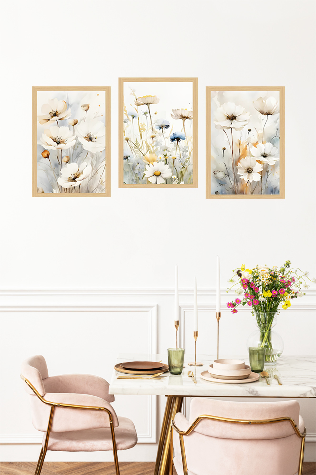 🌼 Su Bazlı Pastel Renklerde Papatya Desenli 3’lü Çerçeve Görünümlü Tablo Seti 🌼 CRVS1116