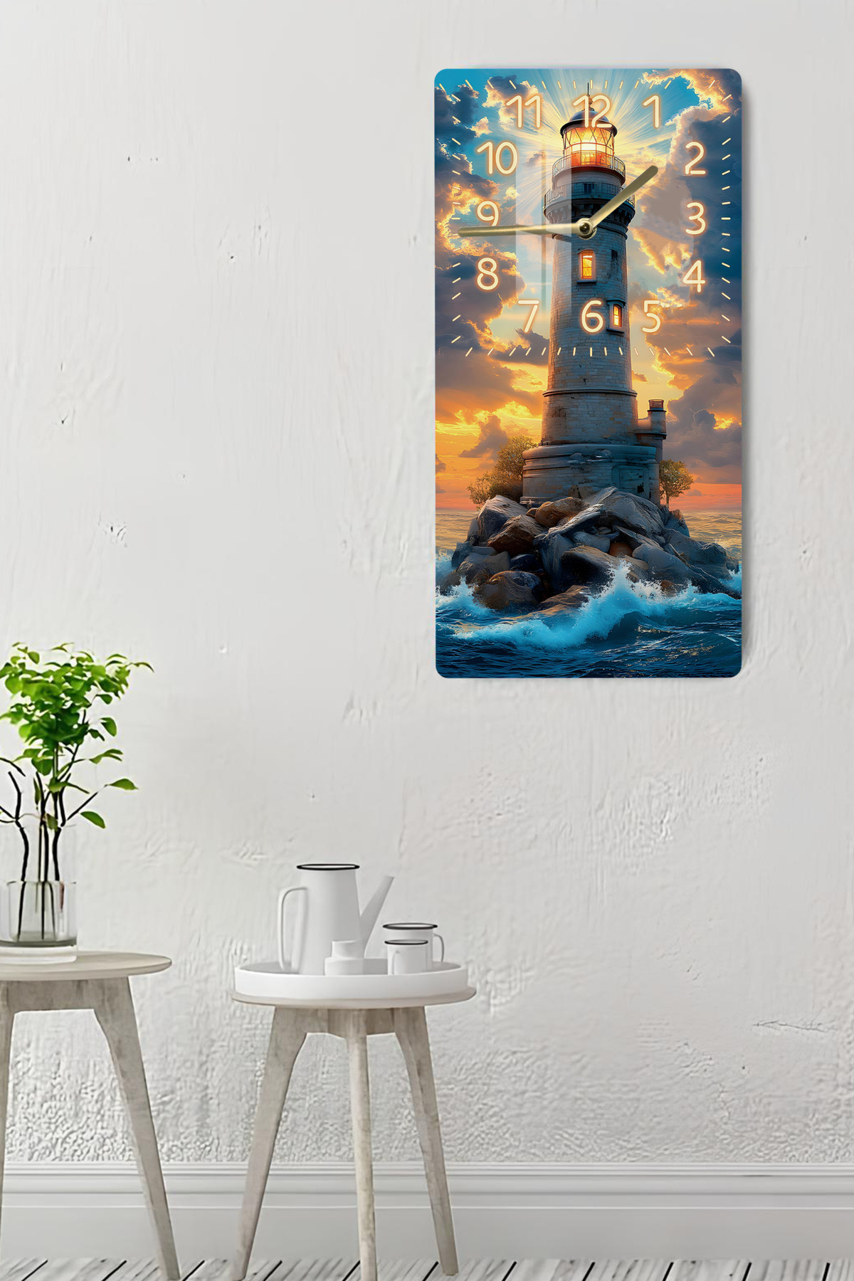 Temperli Cam Tablo Saat – Deniz Feneri ve Gün Batımı Manzaralı 30x60cm UV Baskı – CUSD008