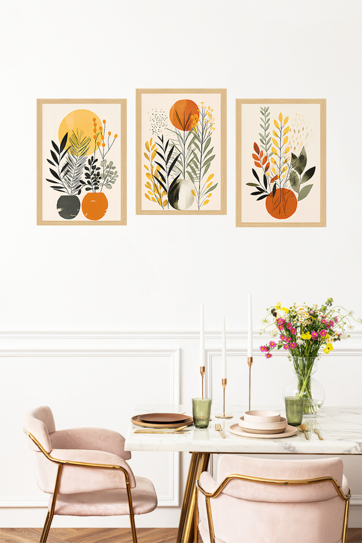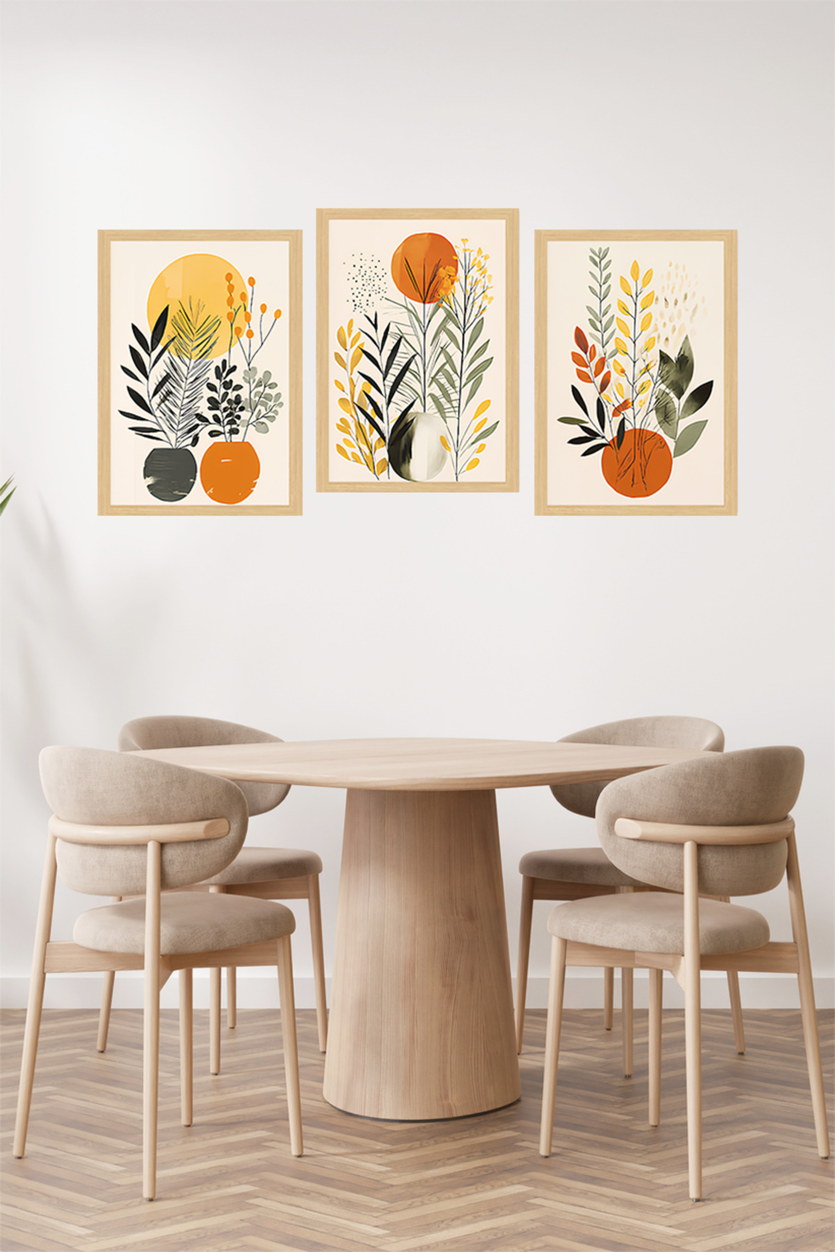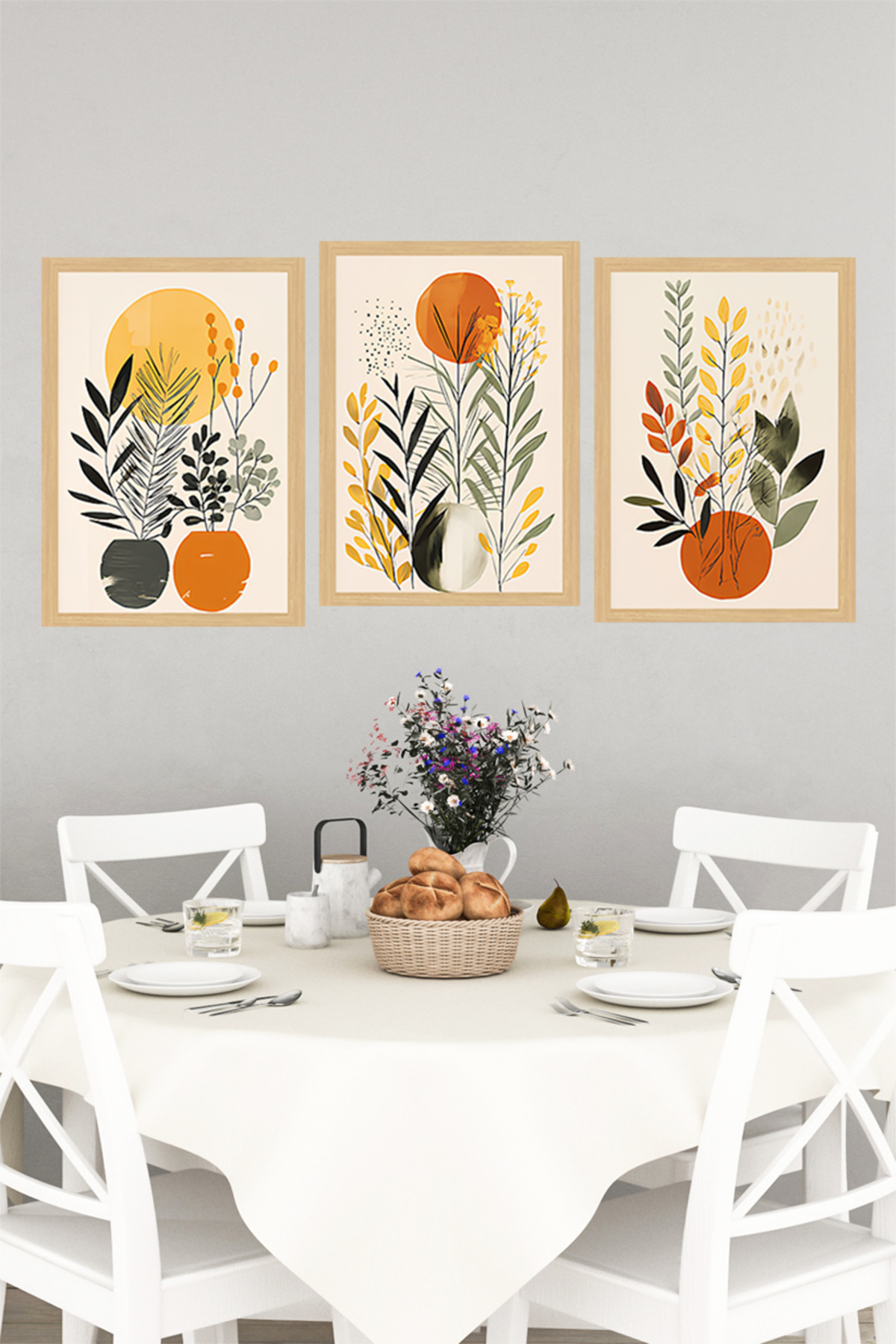 🌿 Turuncu Tonlarda Soyut Bitki ve Vazo Kompozisyonlu 3’lü Tablo Seti ÇERÇEVE GÖRÜNÜMLÜ🌟 CRVS1158