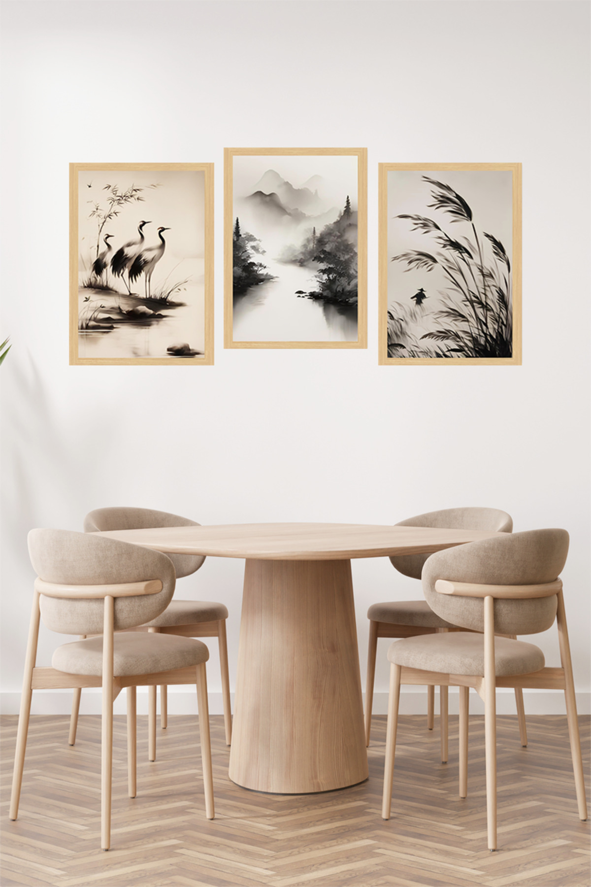 🖼️ Uzak Doğu Esintili Siyah-Beyaz Çerçeve Görünümlü 3’lü Tablo Seti🌟 CRVS1107