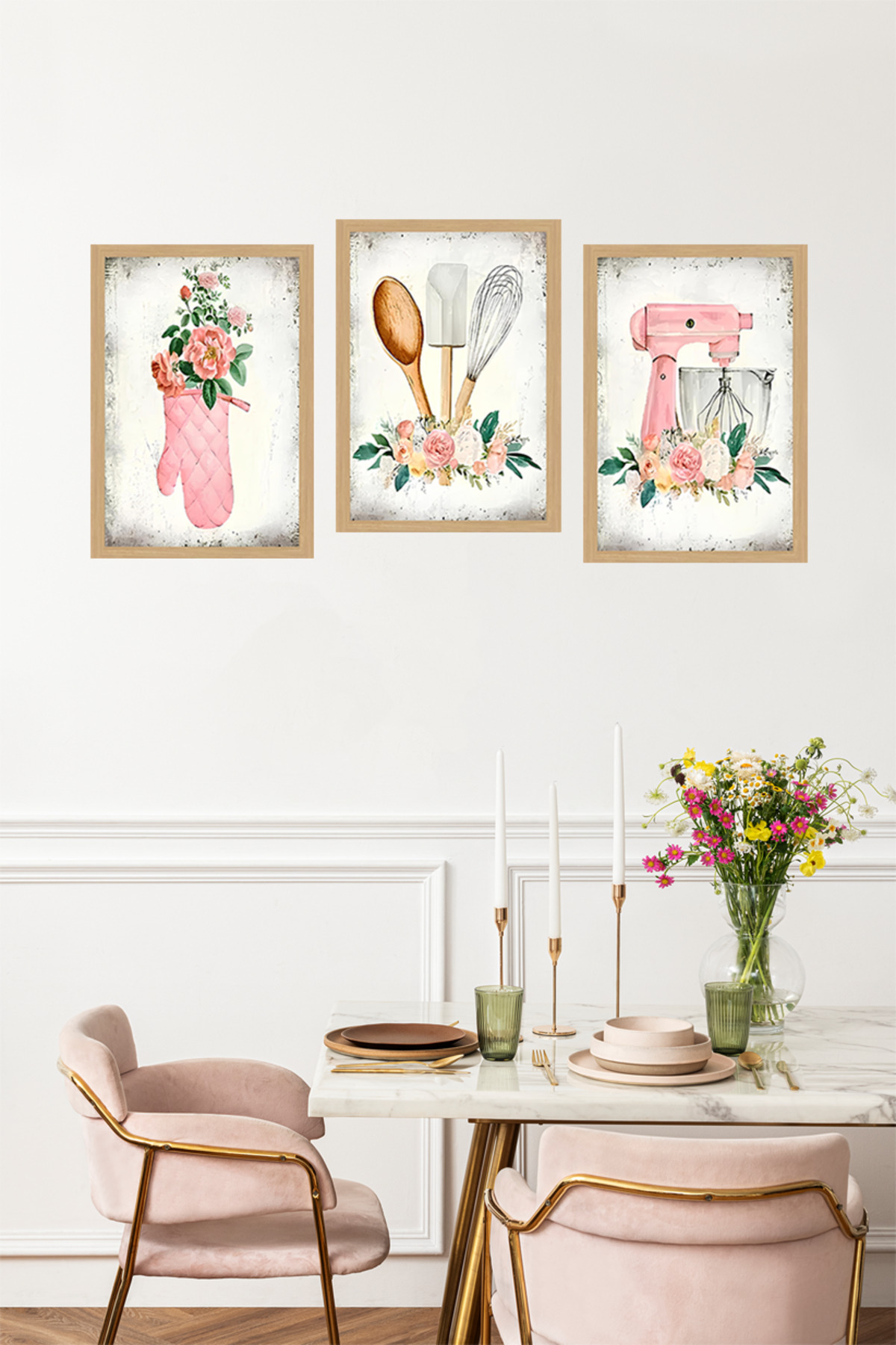 🖼️ Vintage Pembe Çiçekli Mutfak Temalı 3'lü UV Baskılı Tablo Seti - MDF (Çerçevesiz) CRVS1049