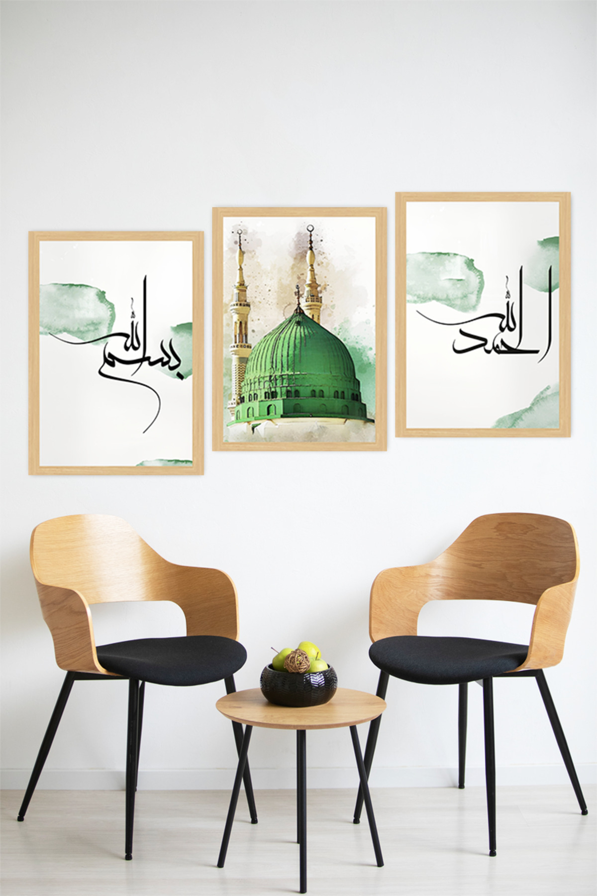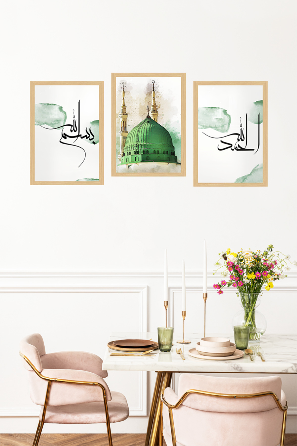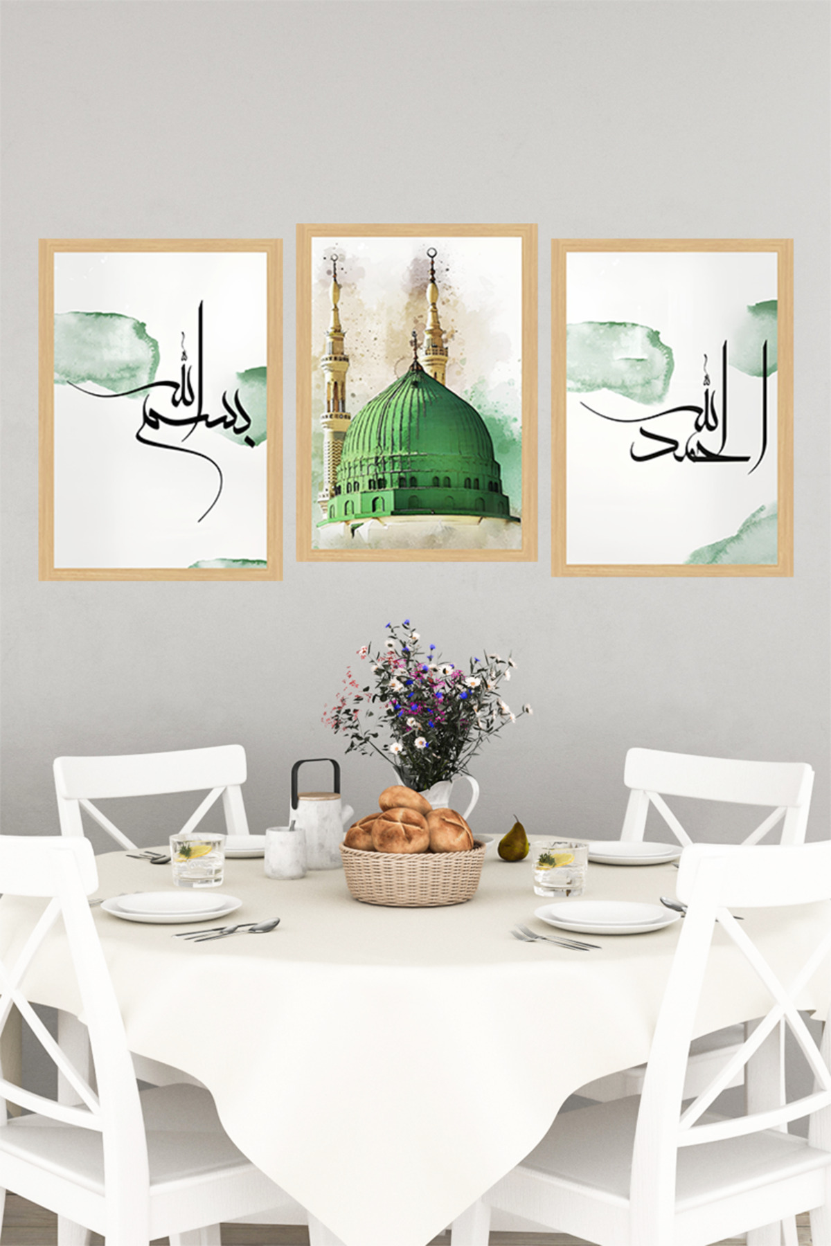 🌿 Yeşil Kubbe ve Hat Yazılı Çerçeve Görünümlü 3'lü Tablo Seti – 3 Ebat Seçeneğiyle! 🕋 CRVS1196