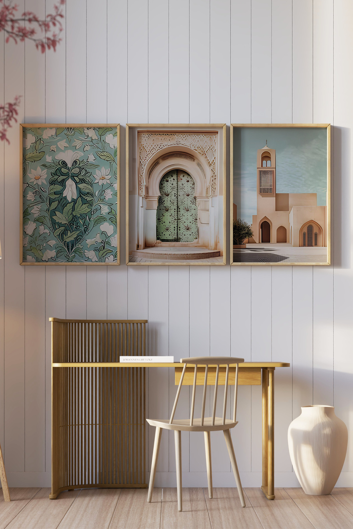 🌿 Yeşil Tonlarda Mimari ve Doğa Temalı 3'lü Çerçeveli Tablo Seti 🖼️🌸 CRV1217